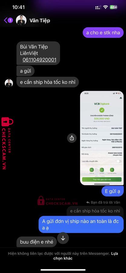 Scammer Alert: Bùi Văn Tiệp Reported: November 16, 2024 Scammer Information Full Name: Bùi Văn Tiệp Payment Gate: LPBank Payment Account: 061104920001 Category: Marketplace scams Source: Checkscam Evidence Files Report Description Nhận tiền xong không gửi hàng mà chặn luôn Comments Your comment Add Comment No comments yet. Be the first to share your experience with this scammer.
