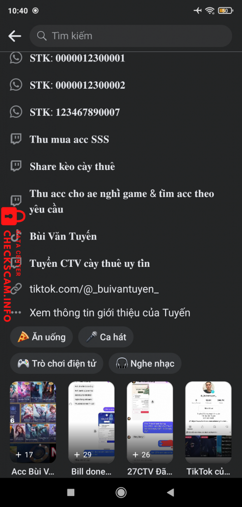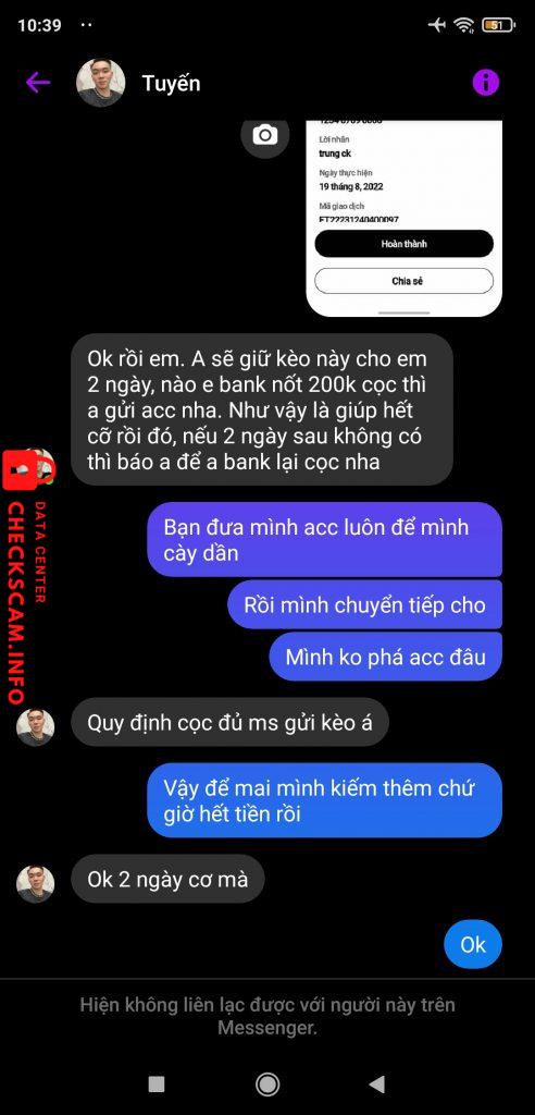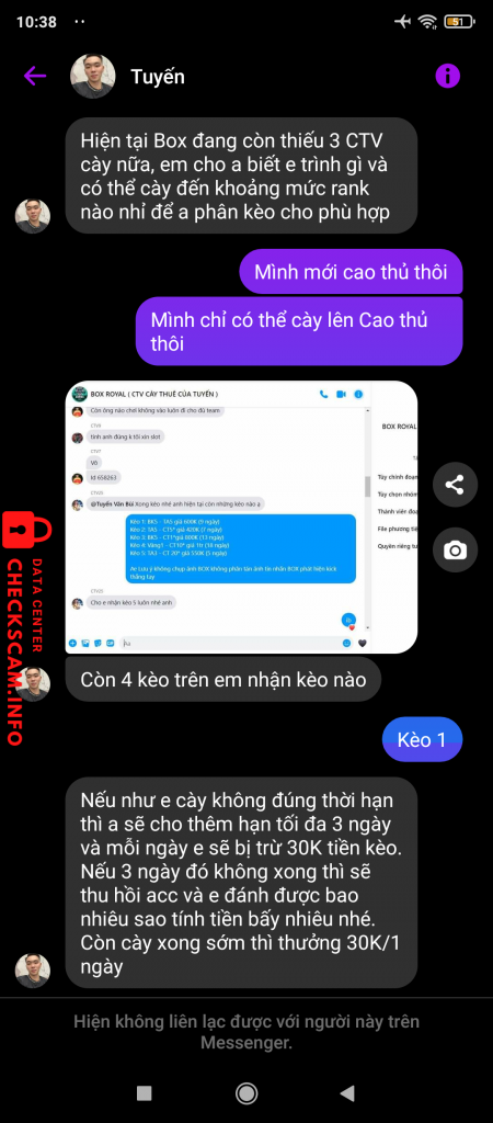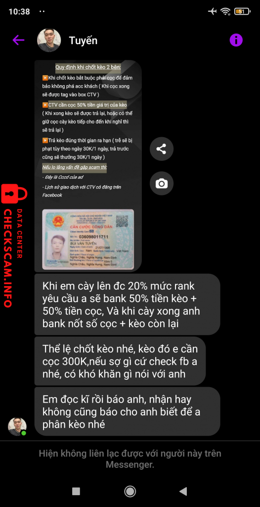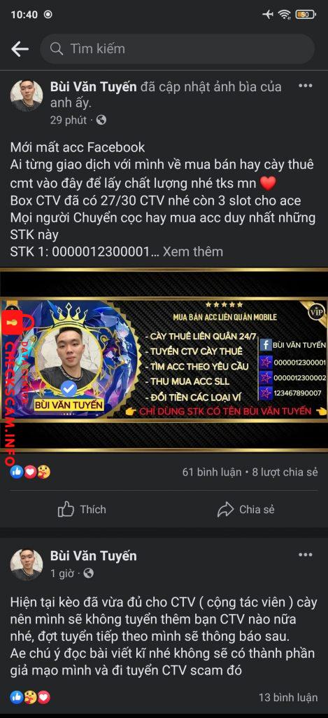 Lừa đảo tuyển CTV cày thuê liên quân cho chọn kèo rồi bắt cọc. Sau khi chuyển cọc sẽ bị chặn. Nó có rất nhiều tài khoản FB và TK Ngân Hàng. Mn hãy cẩn thận.