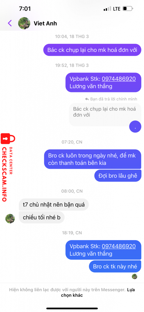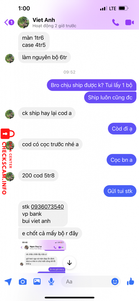 Scammer Alert: Bùi Việt Anh Reported: November 16, 2024 Scammer Information Full Name: Bùi Việt Anh Phone Number: 0936073540 Payment Gate: Vpbank Payment Account: 0936073540 Category: Marketplace scams Source: Checkscam Evidence Files Report Description Scam tiền cọc máy tính, chuyên scam đồ điện tử khu vực quảng trị Comments Your comment Add Comment No comments yet. Be the first to share your experience with this scammer.