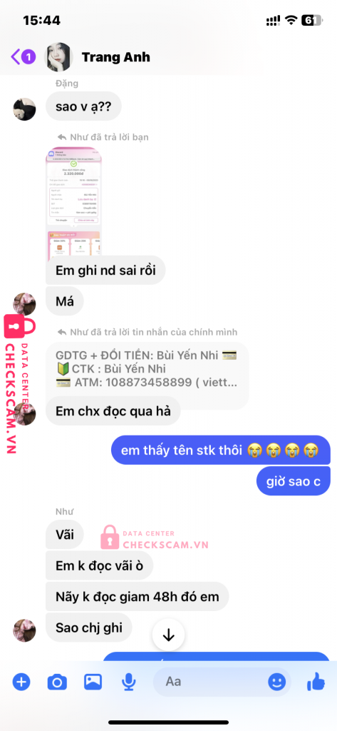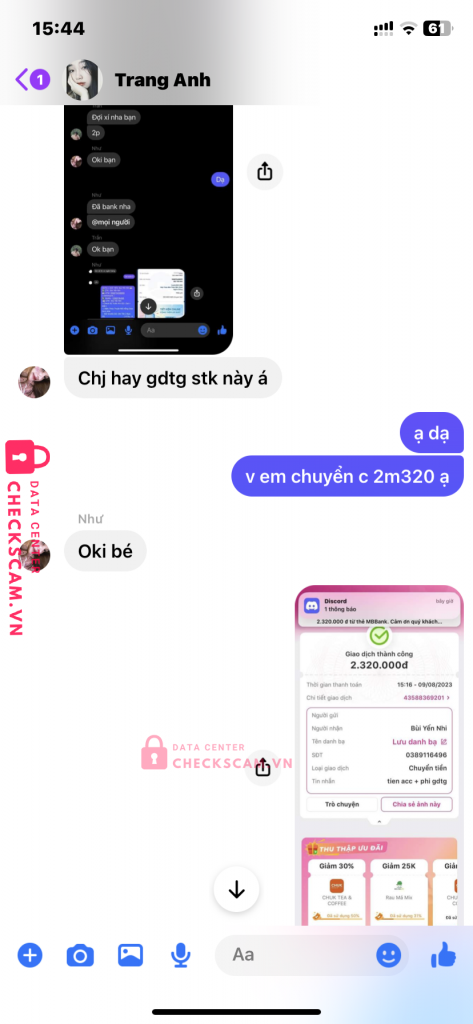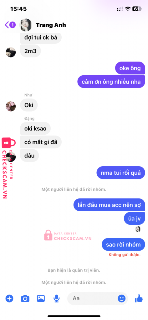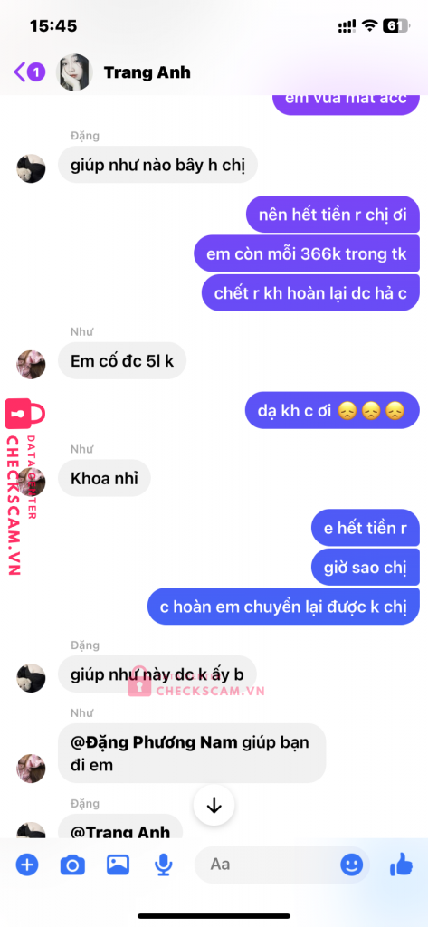 NHƯ HUỲNH VÀ ĐẶNG PHƯƠNG NAM CHUNG MỘT TỔ CHỨC, NHƯ GIẢ LÀM GDTG (NẮM ADMIN 5GR), SAU ĐÓ NAM BÁN ACC XONG DỤ MÌNH GDTG QUA NHƯ, LÚC ĐẦU CK QUA 2.320.000vnd, NHƯ KÊU SAI NỘI DUNG CK NÊN BẮT MÌNH CHUYỂN LẠI TIỀN I NHƯ BAN ĐẦU VỚI ND CK ĐÚNG VÀ SAU ĐÓ HOÀN LẠI TIỀN ND CK SAI, LÚC ĐÓ MÌNH HẾT TIỀN CHỈ CON 366K TRONG TÀI KHOẢN NÊN NHƯ VÀ NAM BẮT ĐẦU NÓI VÀO CẦN 500K MỚI HOÀN LẠI XONG GD TIẾP VÀ NAM CŨNG CHẤP NHẬN RỒI MÌNH CHUYỂN CHO NAM 360K. TỔNG CỘNG LỪA MÌNH 2.680.000 :((, MONG AD DUYỆT Ạ