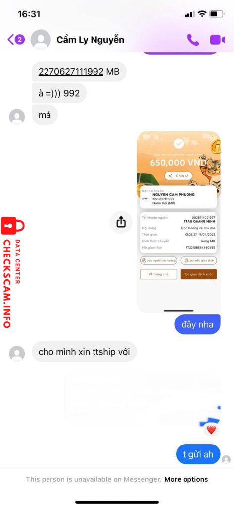 Scammer Alert: Cam Phuong Reported: November 16, 2024 Scammer Information Full Name: Cam Phuong Payment Gate: MB Bank Payment Account: 2270627111992 Category: Marketplace scams Source: Checkscam Evidence Files Report Description Lừa đảo nhiều người Comments Your comment Add Comment No comments yet. Be the first to share your experience with this scammer.