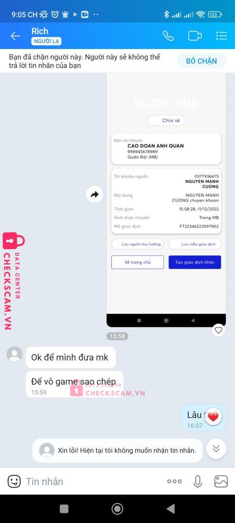 Scam game , ban đầu xin số dt không cho mình cũng chủ quan , đưa nó sdt nó scam xong không tra dc sdt nó mà số cũng là số rác nó tạo acc zalo ,không phải số chính chỉ có tên tk và số tk