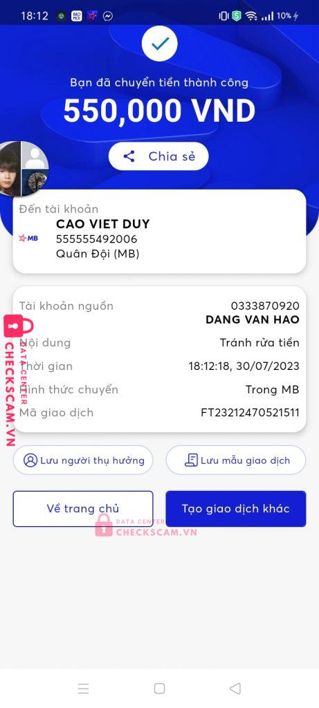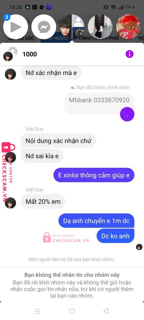 Scammer Alert: Cao Việt Duy Reported: November 16, 2024 Scammer Information Full Name: Cao Việt Duy Phone Number: 086855248 Payment Gate: Mb Bank Payment Account: 086855248 Category: Marketplace scams Source: Checkscam Evidence Files Report Description Có 2 người đã thông đồng với nhau để lừa tôi hi vọng có thể xử lí Comments Your comment Add Comment No comments yet. Be the first to share your experience with this scammer.