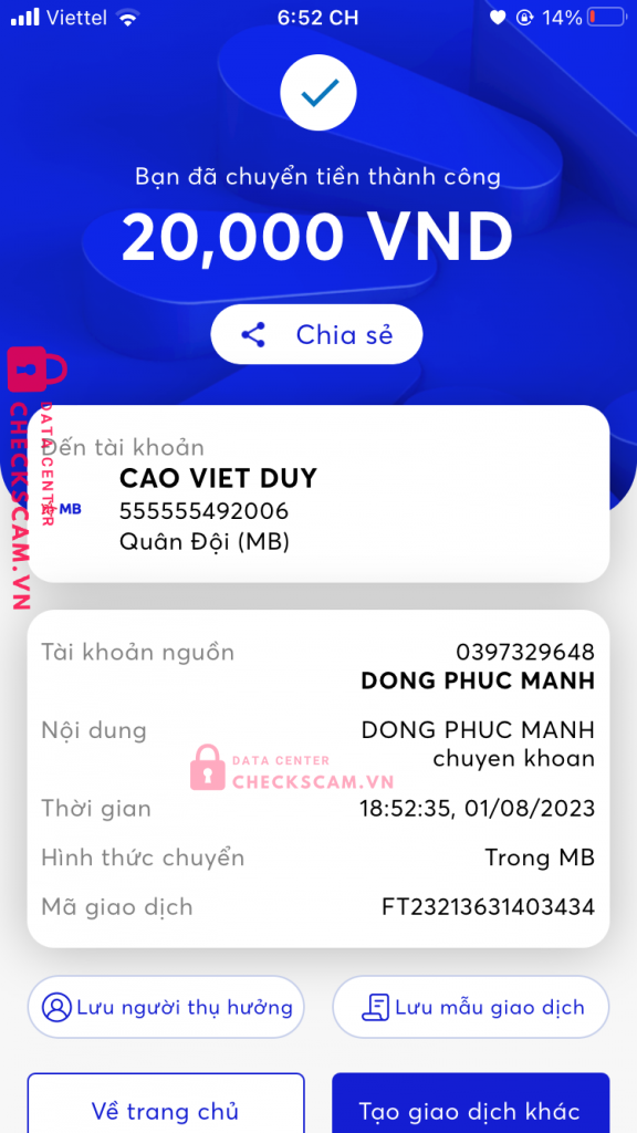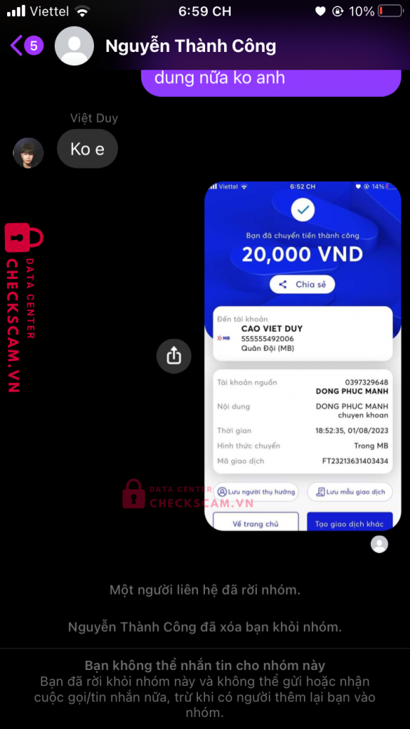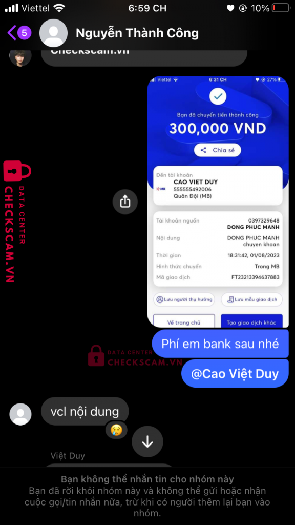 Scammer Alert: Cao Việt Duy Reported: November 16, 2024 Scammer Information Full Name: Cao Việt Duy Payment Gate: MB Payment Account: 555555492006 Category: Marketplace scams Source: Checkscam Evidence Files Report Description Scam bằng wew adcheckscam.vn Comments Your comment Add Comment No comments yet. Be the first to share your experience with this scammer.