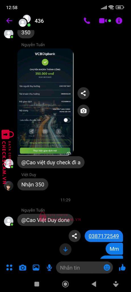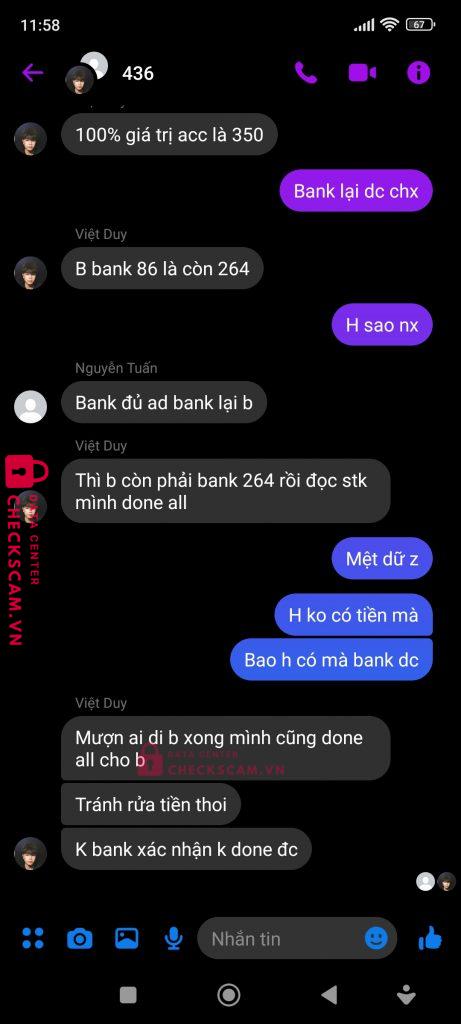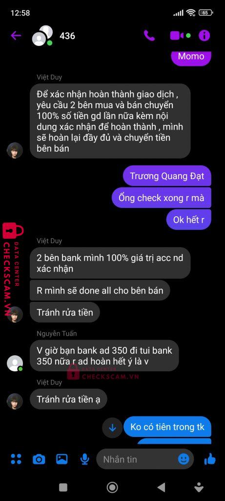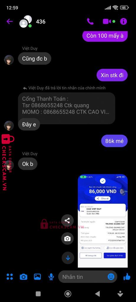 Scammer Alert: Cao Việt Duy Reported: November 16, 2024 Scammer Information Full Name: Cao Việt Duy Phone Number: 0868655248 Payment Gate: MBbank Payment Account: 555555492006 Category: Marketplace scams Source: Checkscam Evidence Files Report Description Th mua kêu nó r bị scam luôn tưởng tick xanh ngon lắm ai ngờ scam( tui cx mất tiền) Comments Your comment Add Comment No comments yet. Be the first to share your experience with this scammer.