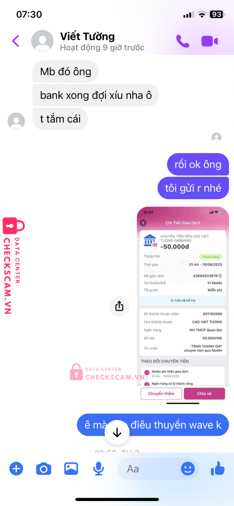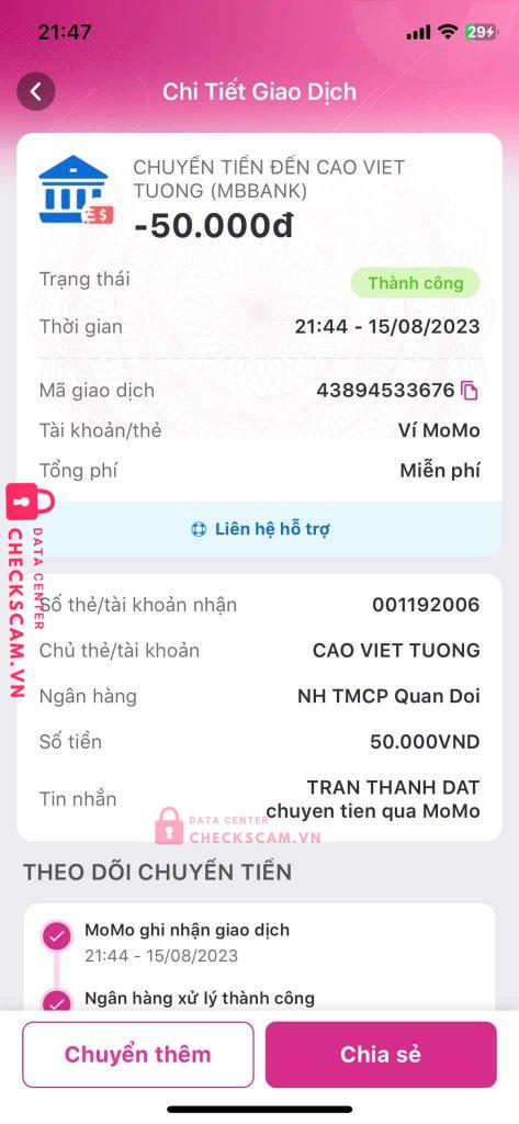 Scammer Alert: Cao Viết Tường Reported: November 16, 2024 Scammer Information Full Name: Cao Viết Tường Payment Gate: Mb bank Payment Account: 001192006 Category: Marketplace scams Source: Checkscam Evidence Files Report Description Do vì bận 1 số công việc ko thể trung gian nên tôi đã bank thẳng vì thấy cách nói chuyện khá uy tín Comments Your comment Add Comment No comments yet. Be the first to share your experience with this scammer.