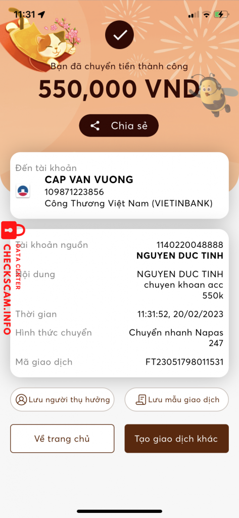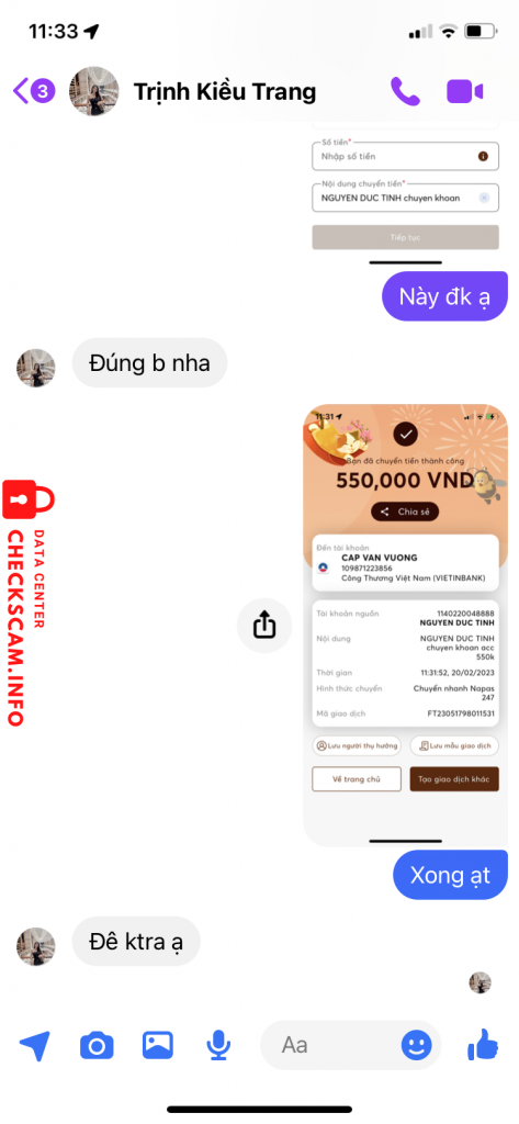 Scammer Alert: Cap Van Vuong Reported: November 16, 2024 Scammer Information Full Name: Cap Van Vuong Payment Gate: VIETTINBANK Payment Account: 109871223856 Category: Marketplace scams Source: Checkscam Evidence Files Report Description Fb : Trịnh Kiều Trang admin group mua bán acc game 260k tv lđ Comments Your comment Add Comment No comments yet. Be the first to share your experience with this scammer.