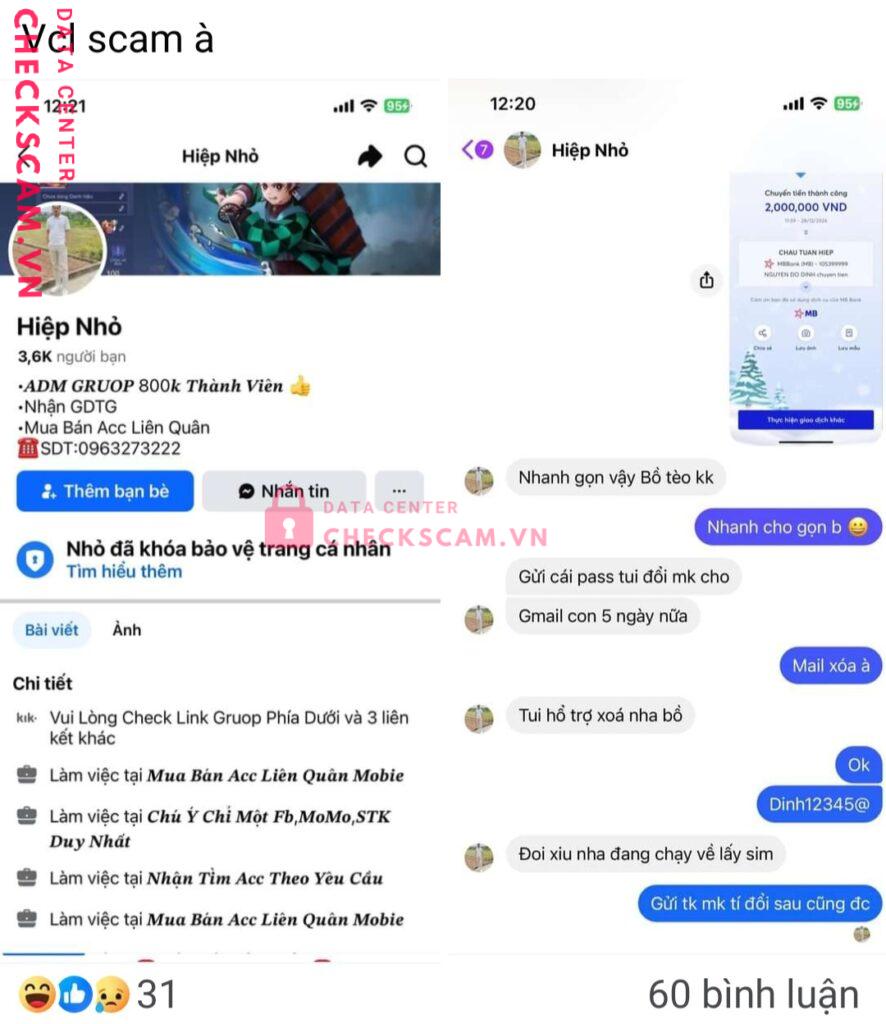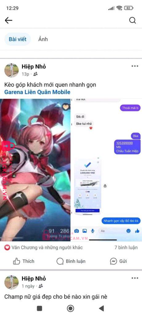 Thằng Châu Tuấn Hiệp này buôn bán lỏ acc Liên Quân scam 2 củ của người mua , nó còn cắt đoạn chat phần nạn nhân bank tiền ra để đăng bài lùa gà nữa, mong ad cho nó lên checkscam để cảnh báo cho mng