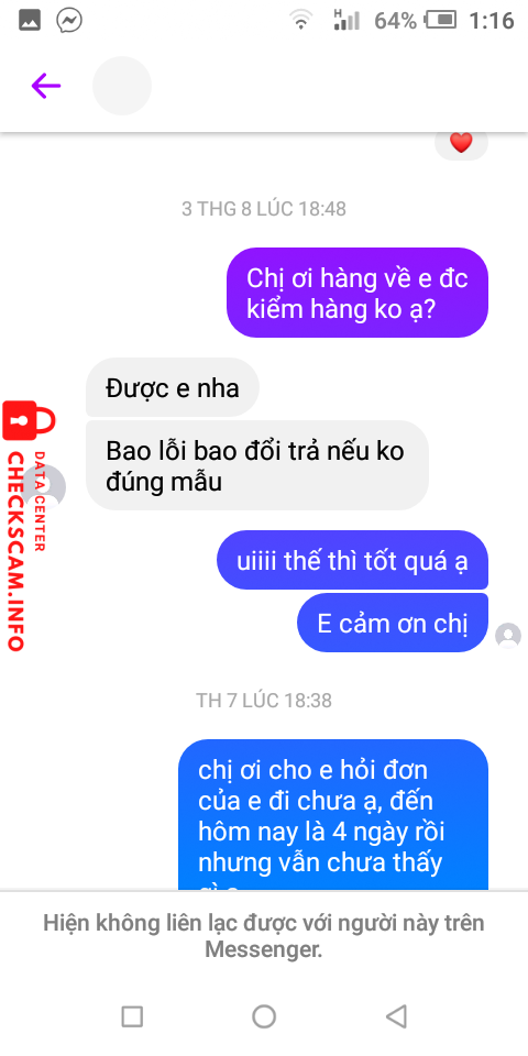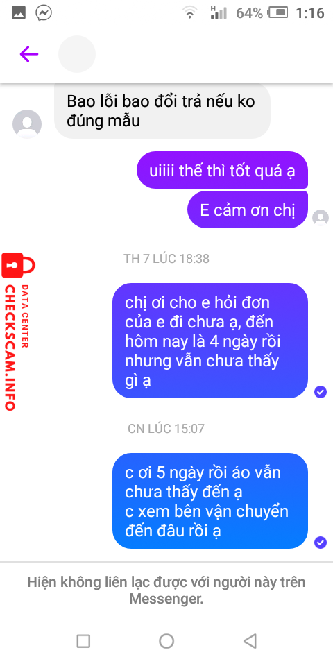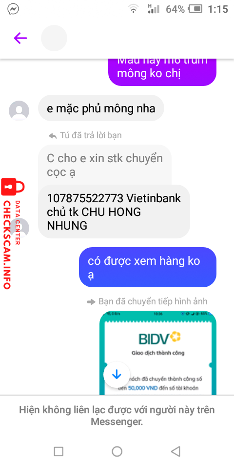Scammer Alert: CHU HONG NHUNG Reported: November 16, 2024 Scammer Information Full Name: CHU HONG NHUNG Payment Gate: Vietinbank Payment Account: 107875522773 Category: Marketplace scams Source: Checkscam Evidence Files Report Description Lừa cọc xong không gửi hàng khách hỏi lại block chặn luôn Comments Your comment Add Comment No comments yet. Be the first to share your experience with this scammer.