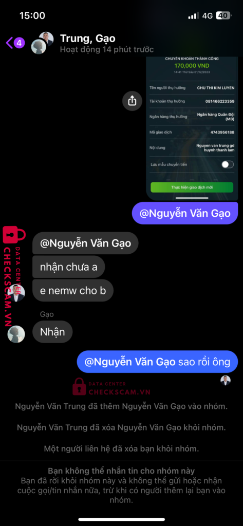 Scammer Alert: CHU THI KIM LUYEN Reported: November 16, 2024 Scammer Information Full Name: CHU THI KIM LUYEN Payment Gate: MB Payment Account: 081466223359 Category: Marketplace scams Source: Checkscam Evidence Files Report Description Mình mua acc liên quân , nhưng thấy nó có tích xanh chính chủ , cùng vài một đứa bảo uy tín nên lỡ chuyển khoản tiền cho nó , xong thì bị nó chặn Comments Your comment Add Comment No comments yet. Be the first to share your experience with this scammer.