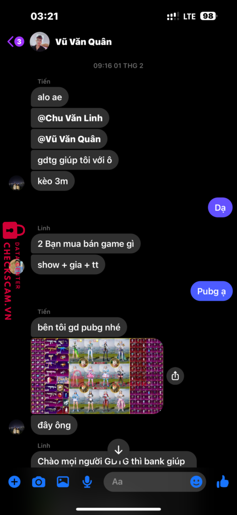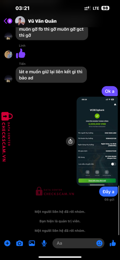 Scammer Alert: CHU VAN LINH Reported: November 16, 2024 Scammer Information Full Name: CHU VAN LINH Payment Gate: ABBANK Payment Account: 0364423126 Category: Marketplace scams Source: Checkscam Evidence Files Report Description 2 thằng này cấu kết lừa đảo nhé ae chủ grup 200k tv có tích xanh mà em chuyển tiền xong nó chạy block em luôn mn ạ Comments Your comment Add Comment No comments yet. Be the first to share your experience with this scammer.