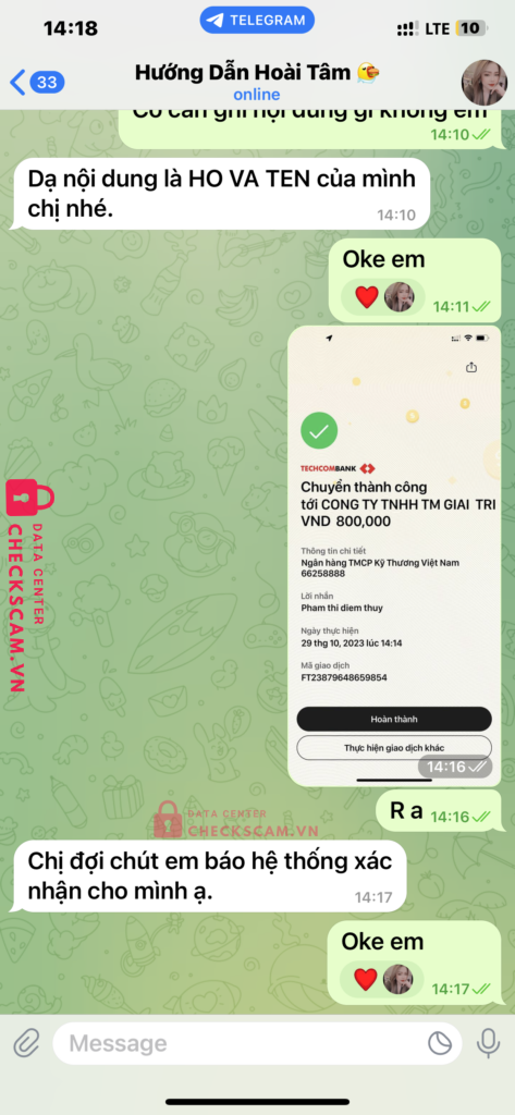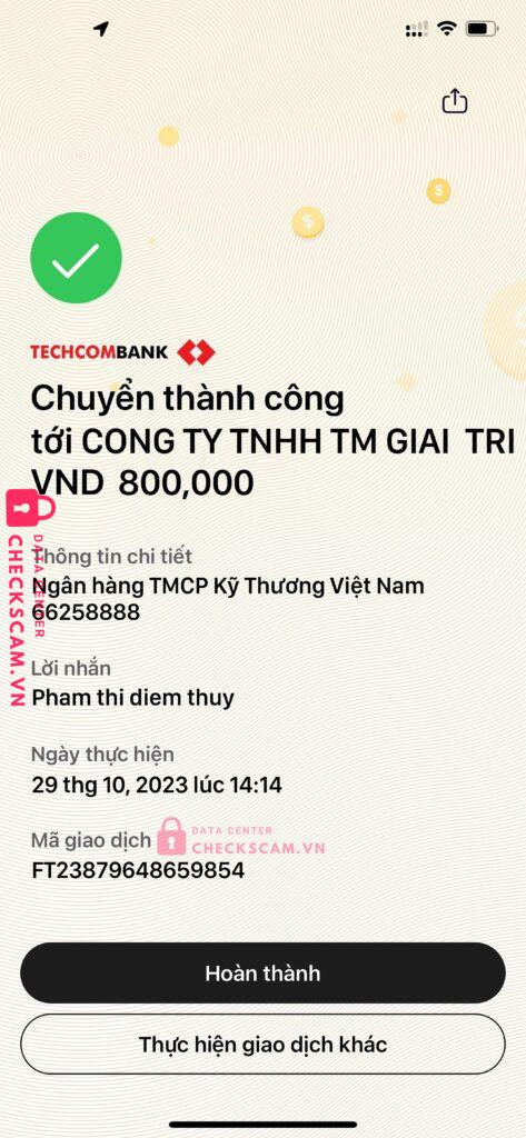 Scammer Alert: CONG TY TNHH TM GIAI TRI Reported: November 16, 2024 Scammer Information Full Name: CONG TY TNHH TM GIAI TRI Payment Gate: Techcombank Payment Account: 66258888 Category: Marketplace scams Source: Checkscam Evidence Files Report Description Lừa đảo chuyển tiền làm nhiệm vụ Comments Your comment Add Comment No comments yet. Be the first to share your experience with this scammer.