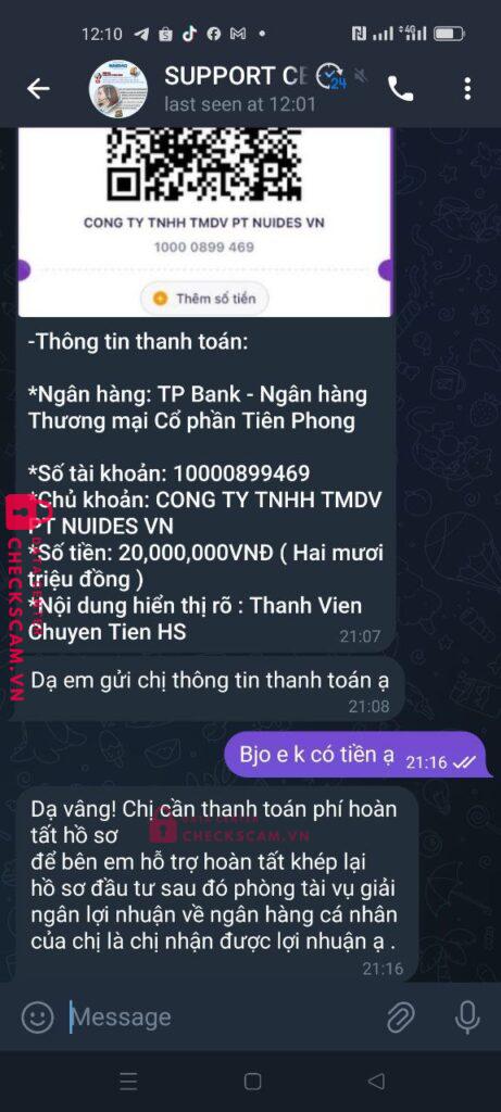 Scammer Alert: CONG TY TNHH TMDV PT NUIDES VN Reported: May 10, 2025 Scammer Information Full Name: CONG TY TNHH TMDV PT NUIDES VN Payment Gate: TP Bank Payment Account: 10000899469 Category: Marketplace scams Source: Checkscam Evidence Files Report Description lừa đảo chơi tiền nạp không rút được Comments Your comment Add Comment M Marley Deckow 10 months ago They also scammed me on Alibaba.com.