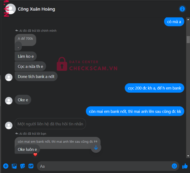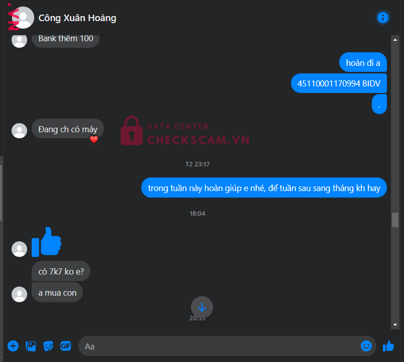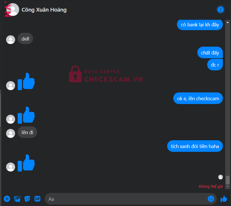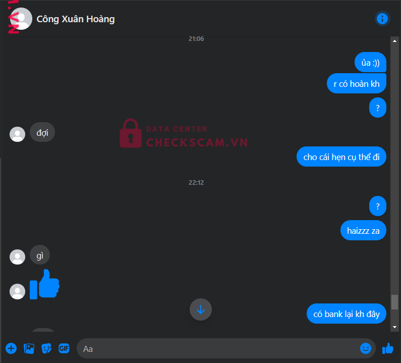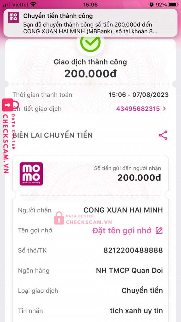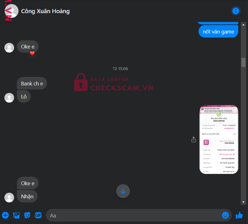 Scammer Alert: CONG XUAN HAI MINH Reported: November 16, 2024 Scammer Information Full Name: CONG XUAN HAI MINH Payment Gate: MB Bank Payment Account: 8212200488888 Category: Marketplace scams Source: Checkscam Evidence Files Report Description Tích xanh đói scam 200k, thu hồi stk để kh có bằng chứng gửi stk Comments Your comment Add Comment No comments yet. Be the first to share your experience with this scammer.