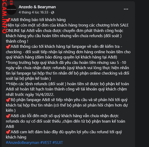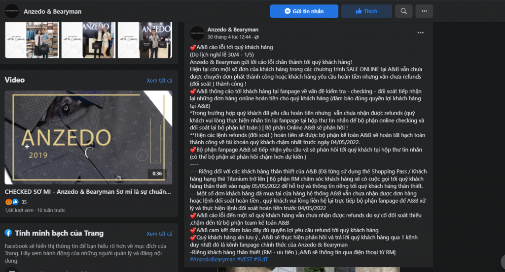 Cty này lùa gà rất nhiều Khách Hàng. Mình mua ở CH nhưng ko có size, bên đó bảo chuyển tiền thanh toán rồi chuyển hàng CH khác vài ngày sau nhận hàng, nhưng sau đó đóng mặt bằng, gọi không nghe máy. Chỉ chat zalo mà hẹn từ tháng 1 tới tháng 5, không trả tiền cho khách.