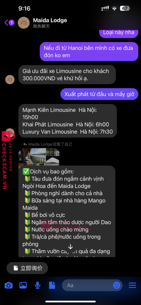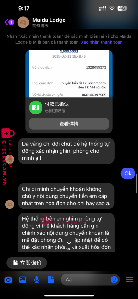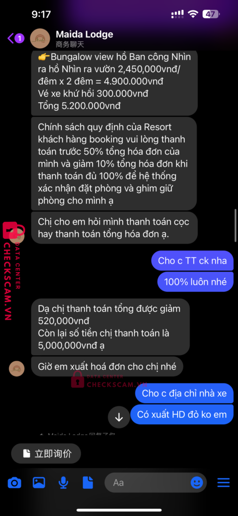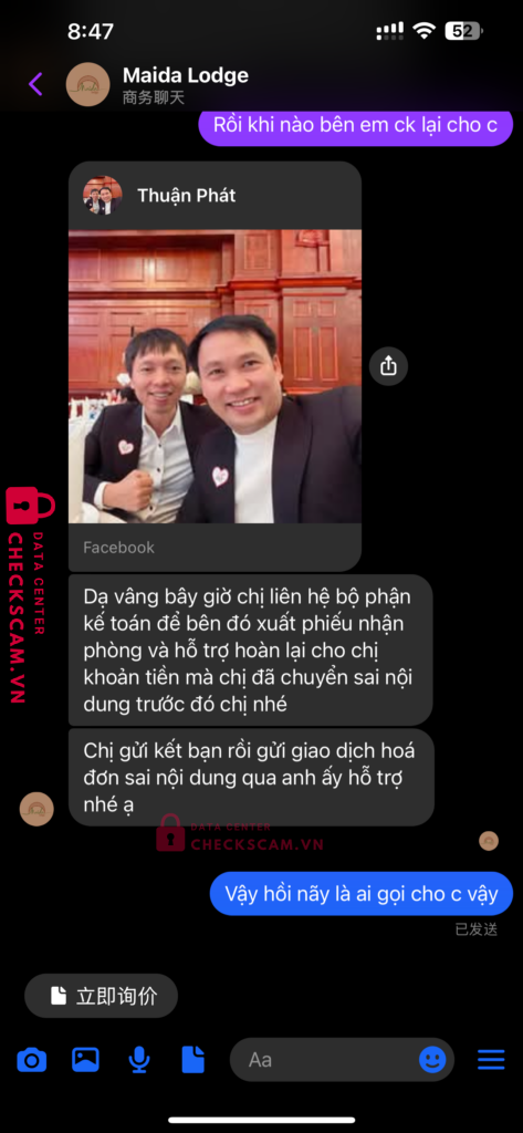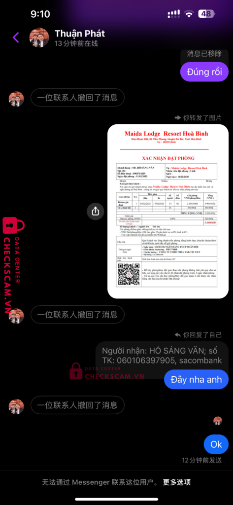 Nhái resort cùng tên, xong mình liên hệ book phòng sau đó kiu mình ghi nội dung sai, mình đang bận cũng ngu ck thêm 1 lần nữa, xong bọn đó kiu hoàn tiền lại cho mình, kiu mình add FB của thằng kế toán, kiu mình mở App ra hướng dẫn hoàn tiền, mình nghe xong hỏi nó lừa đảo hả thì chặn mình hết trơn; số dt 083 7519146 này là 1 con bé giọng Bắc, thằng kế toán FB tên Thuận Phát, cty vừa thành lập vào tháng 1/2025 luôn, mai mình sẽ đi báo công an