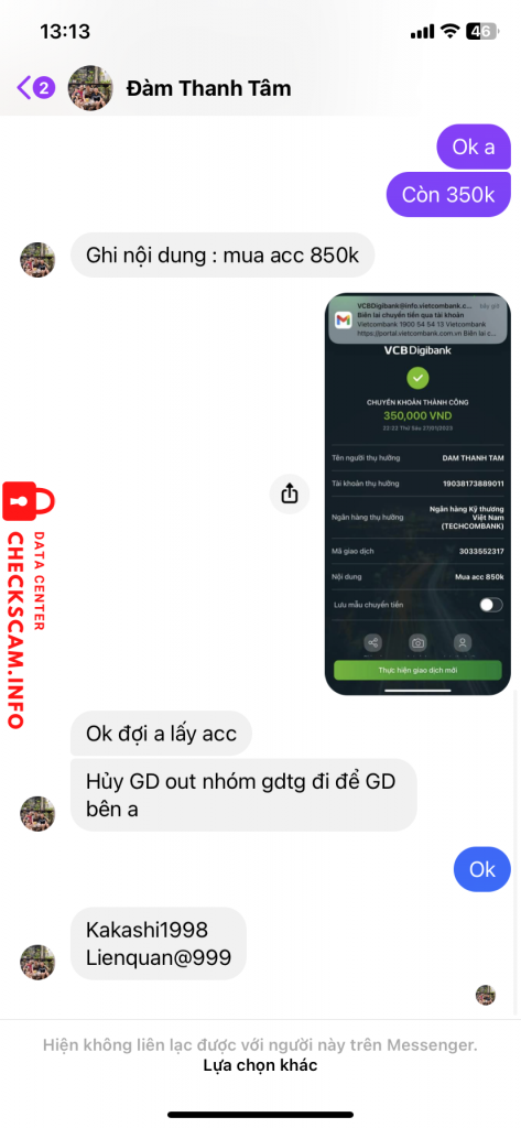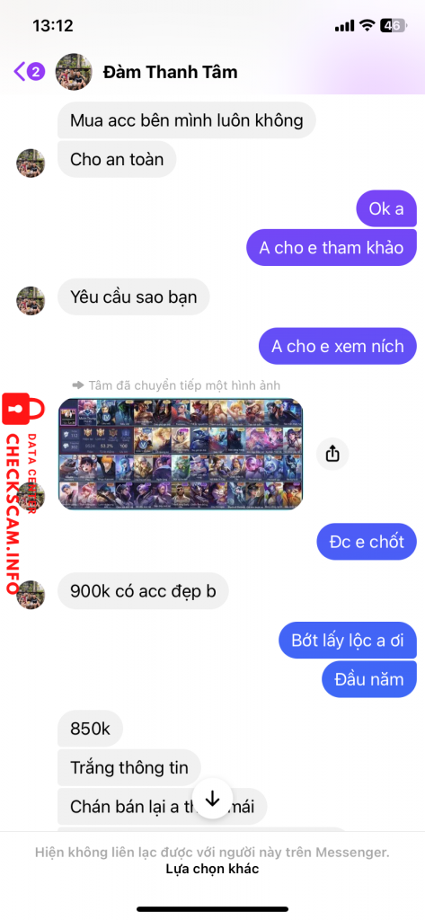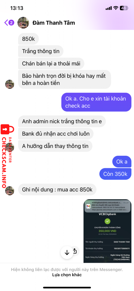 Mình có mua acc liên quân của 1 người và người đó đã nhờ thằng DAM THANH TAM ad của grup để gdtg.acc trị giá 500k. Mình đã chuyển 500k cho ad để gdtg Nhưng thằng ad này nói acc kia nạp quân uy lậu và gạ mình mua acc của nó với giá 850k. Vì thấy nó là ad grup nên mình cx ko đề phòng chuyển tiếp 350k cho nó để lấy acc.khi mình chuyển tiền xong nó đã chặn mình. Mong m.n tránh thành phần scam này.