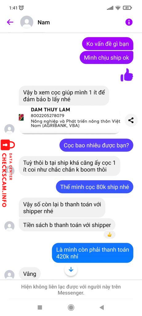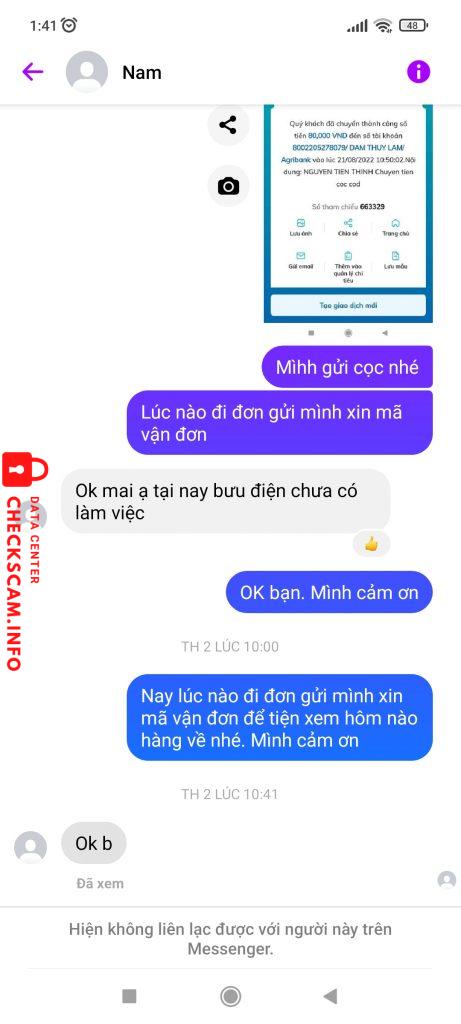 Scammer Alert: DAM THUY LAM Reported: November 16, 2024 Scammer Information Full Name: DAM THUY LAM Payment Gate: Agribank Payment Account: 8002205278079 Category: Marketplace scams Source: Checkscam Evidence Files Report Description Lừa đảo ck cọc cod rồi chặn luôn fb Comments Your comment Add Comment No comments yet. Be the first to share your experience with this scammer.
