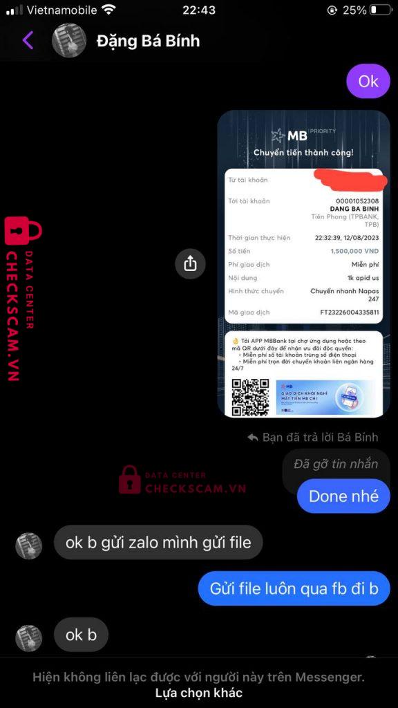 Scammer Alert: Dang Ba Binh Reported: November 16, 2024 Scammer Information Full Name: Dang Ba Binh Payment Gate: TP Bank Payment Account: 00001052308 Category: Marketplace scams Source: Checkscam Evidence Files Report Description Lừa đảo bán id apple. Chuyển khoản xong, block facebook luôn Comments Your comment Add Comment No comments yet. Be the first to share your experience with this scammer.