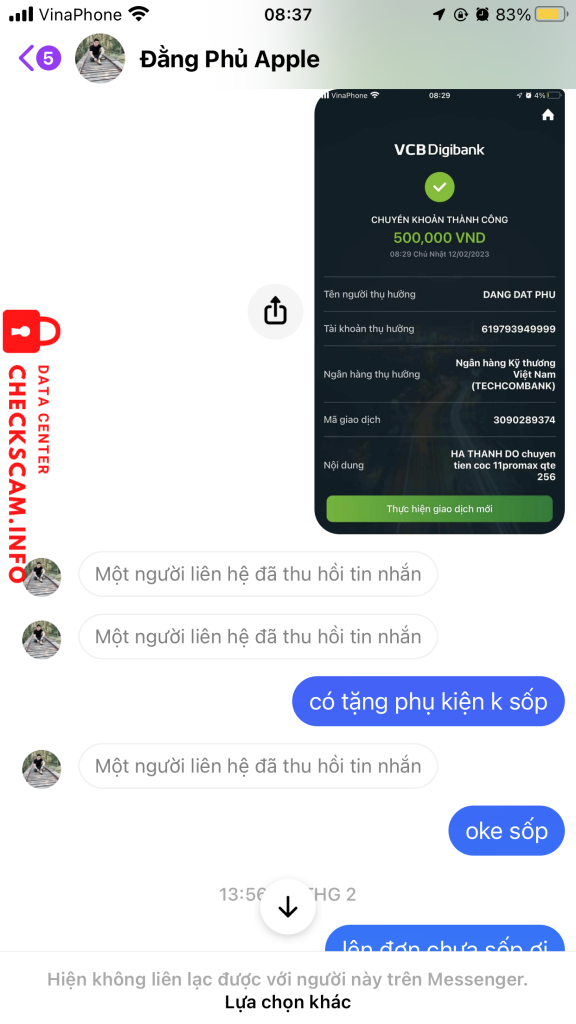 Scammer Alert: DANG DAC PHU Reported: November 16, 2024 Scammer Information Full Name: DANG DAC PHU Payment Gate: Techcombank Payment Account: 619793949999 Category: Marketplace scams Source: Checkscam Evidence Files Report Description Bảo chuyển cọc iphone xong block Comments Your comment Add Comment No comments yet. Be the first to share your experience with this scammer.