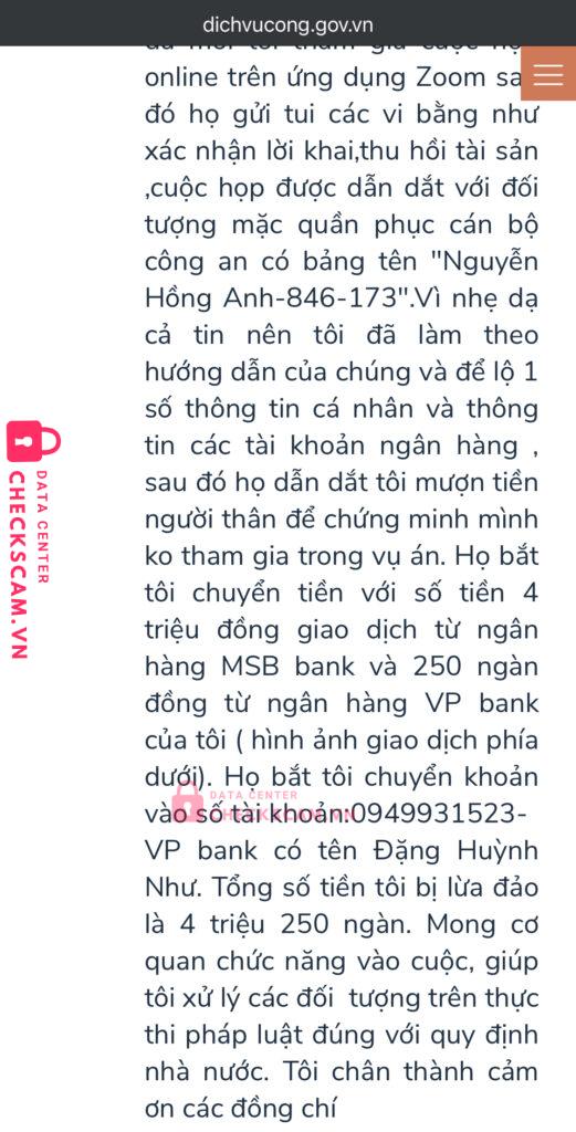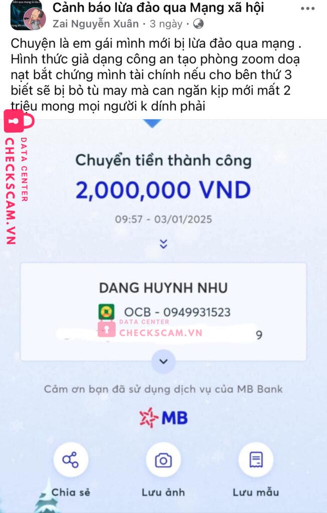 Scammer Alert: DANG HUYNH NHU Reported: March 7, 2025 Scammer Information Full Name: DANG HUYNH NHU Payment Gate: OCB Payment Account: 0949931523 Category: Marketplace scams Source: Checkscam Evidence Files Report Description Ngoài thông tin tôi tổng hợp từ các case bị lừa giống tôi, tôi xin trình bày case của mình Comments Your comment Add Comment No comments yet. Be the first to share your experience with this scammer.