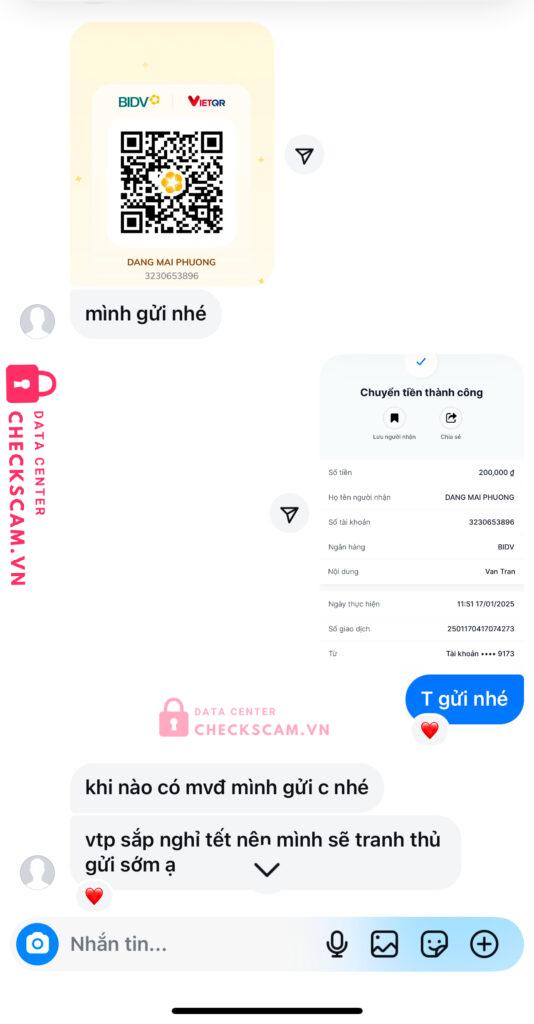Scammer Alert: Dang Mai Phuong Reported: March 7, 2025 Scammer Information Full Name: Dang Mai Phuong Payment Gate: Bidv Payment Account: 3230653896 Category: Marketplace scams Source: Checkscam Evidence Files Report Description T bị con này scam 200k á, nó đăng bài trên thread vs gdich qa ins! Giờ nick thr khoá r Comments Your comment Add Comment No comments yet. Be the first to share your experience with this scammer.