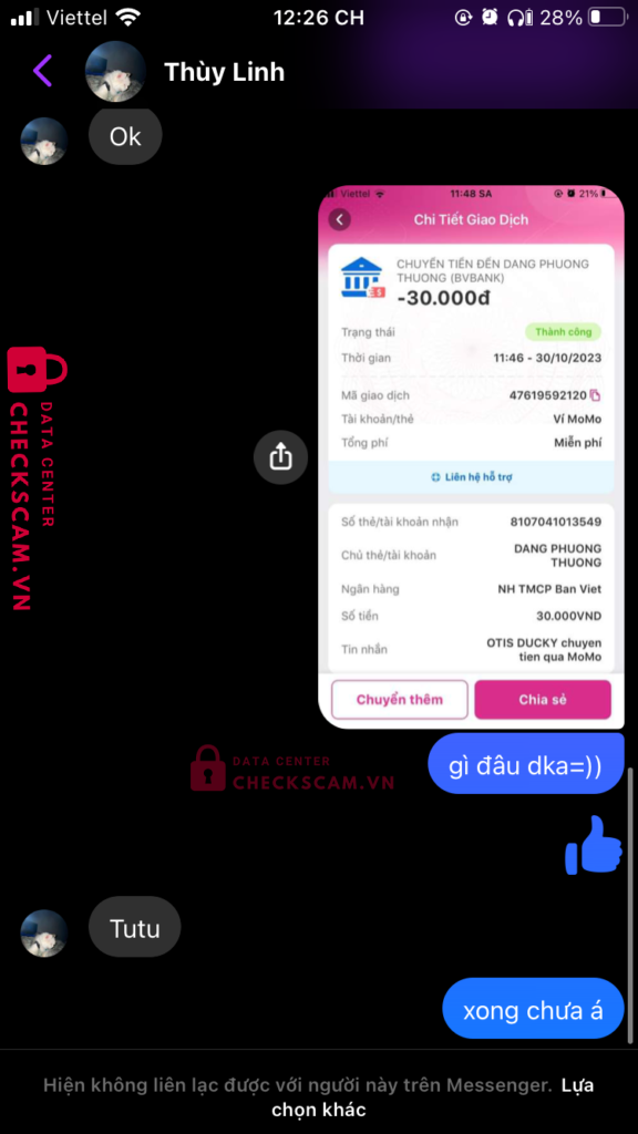 Scammer Alert: DANG PHUONG THUONG Reported: November 16, 2024 Scammer Information Full Name: DANG PHUONG THUONG Payment Gate: BVBANK Payment Account: 8107041013549 Category: Marketplace scams Source: Checkscam Evidence Files Report Description Nhờ nó tạo momo real, nó liên kết ngân hàng rồi húp luôn tiền được chuyển vào Comments Your comment Add Comment No comments yet. Be the first to share your experience with this scammer.