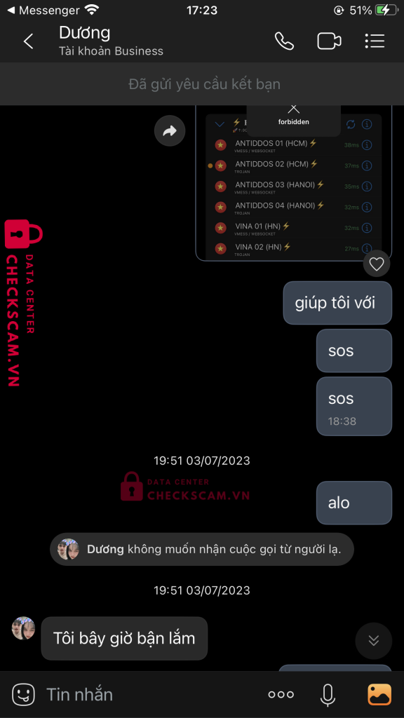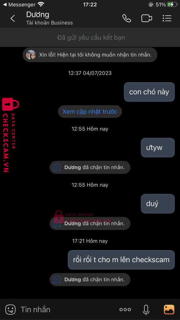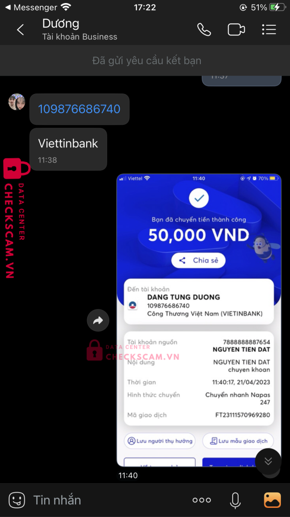 Scammer Alert: DANG TUNG DUONG Reported: November 16, 2024 Scammer Information Full Name: DANG TUNG DUONG Payment Gate: Viettinbank Payment Account: 109876686740 Category: Marketplace scams Source: Checkscam Evidence Files Report Description con cho rach scam 50k mua nhan cúng Comments Your comment Add Comment No comments yet. Be the first to share your experience with this scammer.