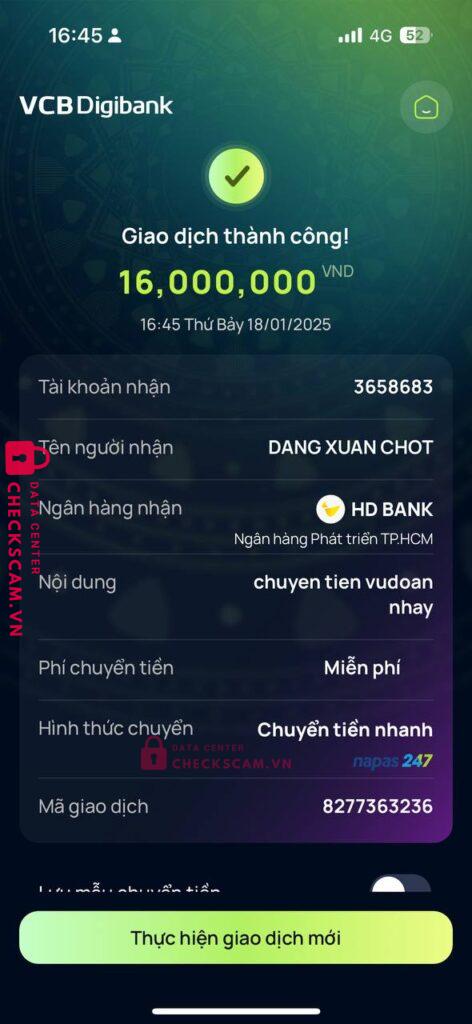 Scammer Alert: DANG XUAN CHOT Reported: March 7, 2025 Scammer Information Full Name: DANG XUAN CHOT Payment Gate: HD BANK Payment Account: 3658683 Category: Marketplace scams Source: Checkscam Evidence Files Report Description Booking show vũ đoàn nhảy. Scam Comments Your comment Add Comment No comments yet. Be the first to share your experience with this scammer.