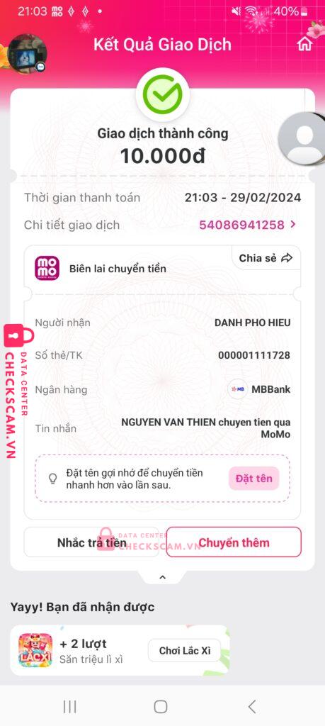 Scammer Alert: DANH PHO HIEU Reported: November 16, 2024 Scammer Information Full Name: DANH PHO HIEU Payment Gate: Momo mbbank Payment Account: 000001111728 Category: Marketplace scams Source: Checkscam Evidence Files Report Description Mình mua acc facebook của bạn ấy mình bank xong bạn ấy block mình luôn Comments Your comment Add Comment No comments yet. Be the first to share your experience with this scammer.
