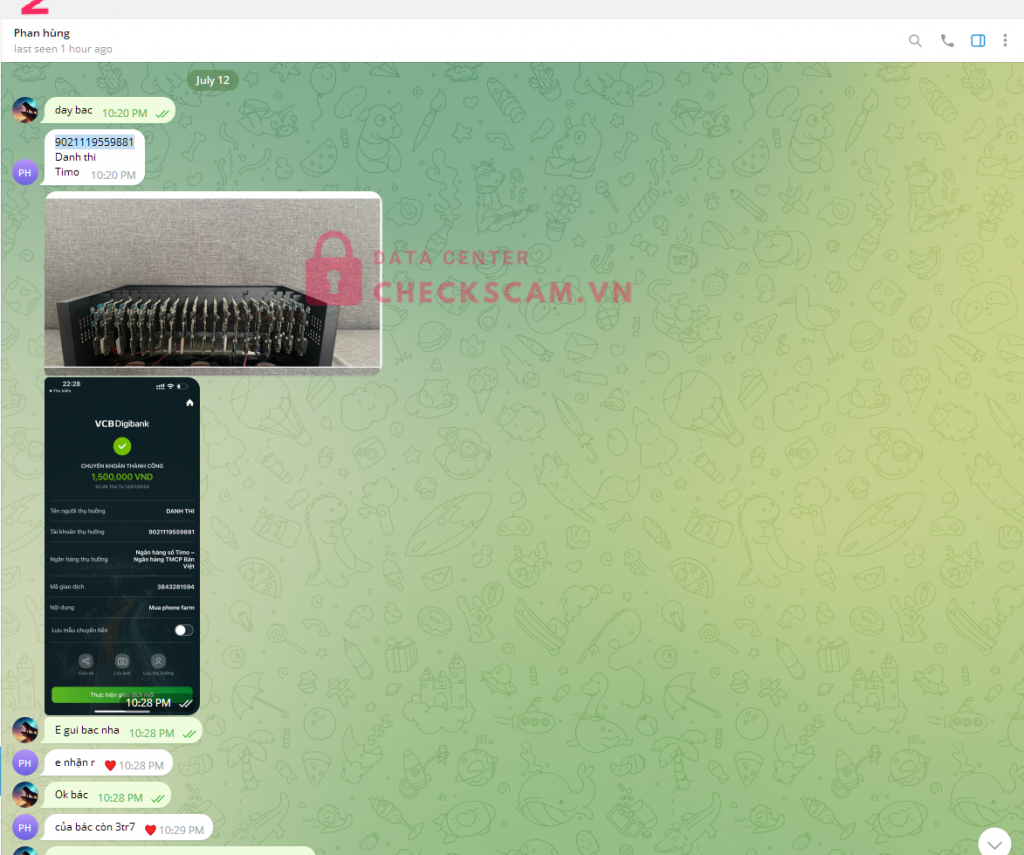 Scammer Alert: Danh Thi Reported: November 16, 2024 Scammer Information Full Name: Danh Thi Phone Number: 0853486555 Payment Gate: Timo Payment Account: 9021119559881 Category: Marketplace scams Source: Checkscam Evidence Files Report Description Mình cọc tiền bộ thiết bị phonefarm của bạn này mà bạn ấy lừa đảo không gửi hàng. Comments Your comment Add Comment No comments yet. Be the first to share your experience with this scammer.