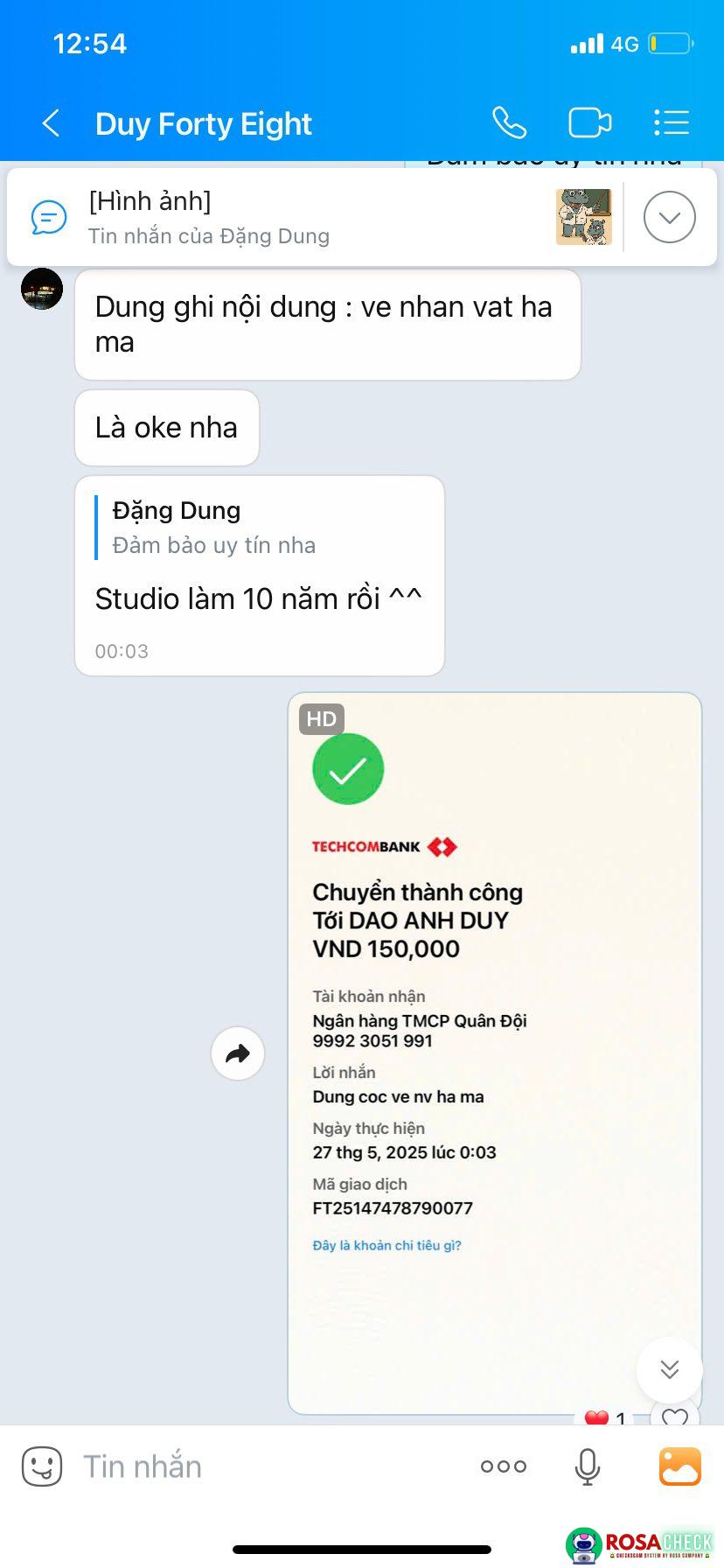 Tối ngày 26/5 mình có đăng bài tuyển người thiết kế nhân vật hoạt hình và bạn Duy Anh có inbox mình để trao đổi về công việc và có chốt lại số tiền là 350k/ nhân vật và hẹn 9h tối hôm sau (tức 27/5) sẽ hoàn thiện. Và báo mình cọc 150k để bạn ý làm.