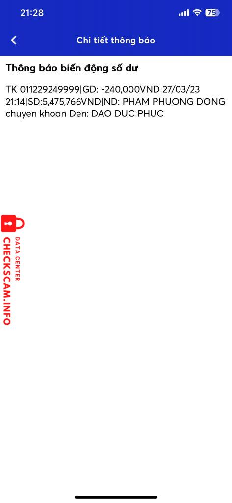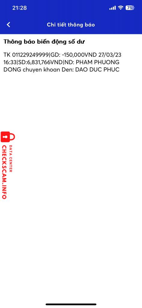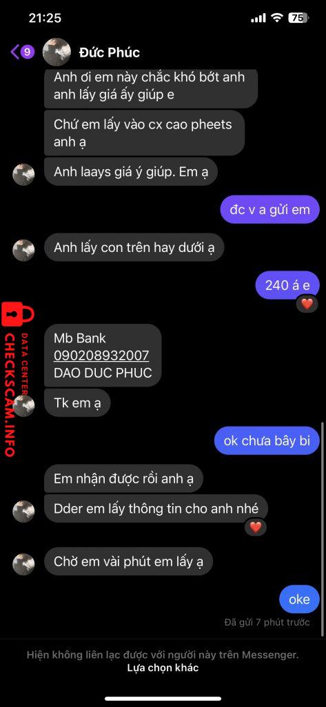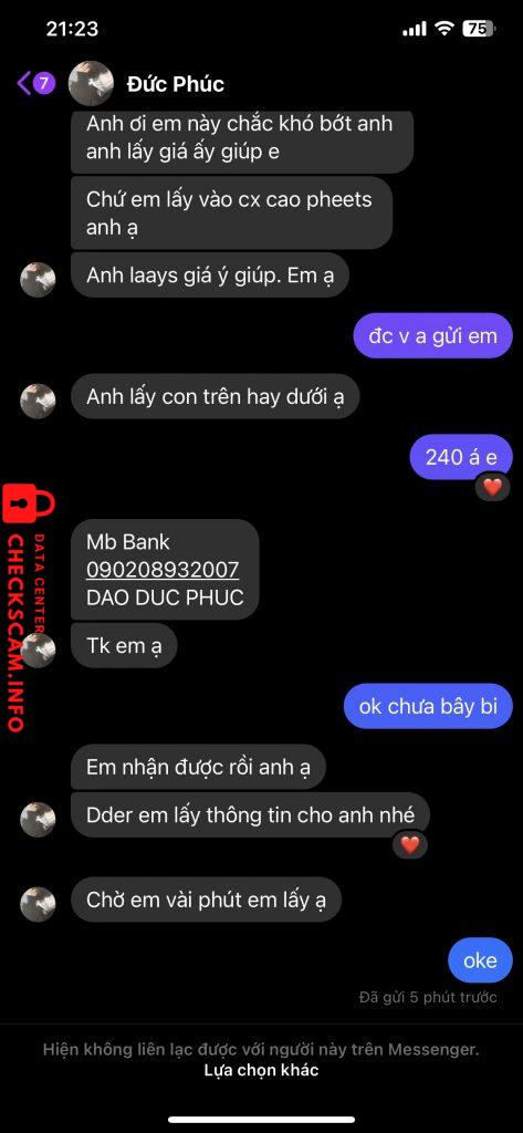 Scammer Alert: DAO DUC PHUC Reported: November 16, 2024 Scammer Information Full Name: DAO DUC PHUC Payment Gate: MB Bank Payment Account: 090208932007 Category: Marketplace scams Source: Checkscam Evidence Files Report Description Mua tiktok của cu em này 2 lần rồi , thấy uy tín nên cũng không trung gian. Mua lần 3 thì block @@ Comments Your comment Add Comment No comments yet. Be the first to share your experience with this scammer.