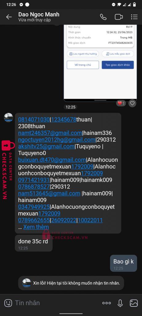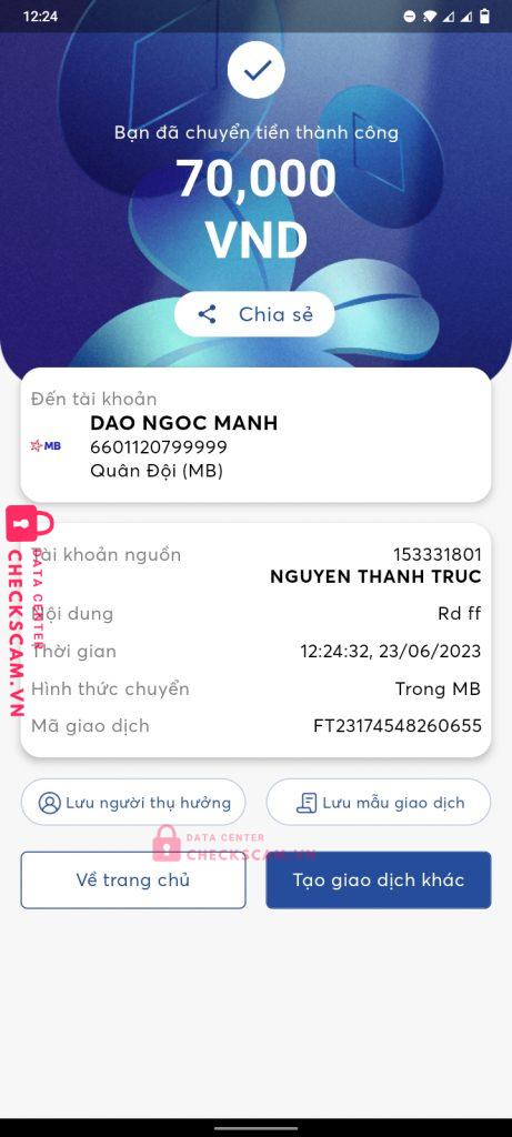 Scammer Alert: Dao Ngoc Manh Reported: November 16, 2024 Scammer Information Full Name: Dao Ngoc Manh Payment Gate: Mb bank Payment Account: 6601120799999 Category: Marketplace scams Source: Checkscam Evidence Files Report Description Người này đã scam rất nhiều người trong đó có tôi Comments Your comment Add Comment No comments yet. Be the first to share your experience with this scammer.