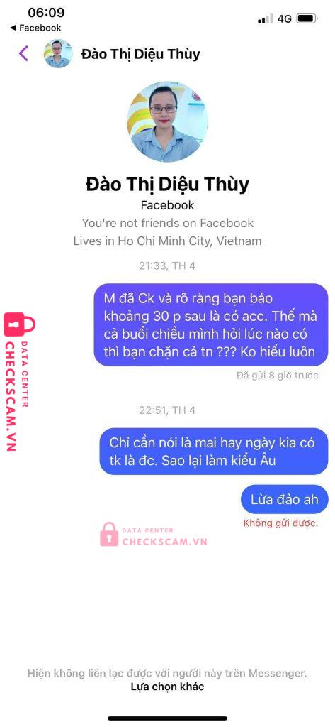 Scammer Alert: Đào Thị Diệu Thùy Reported: November 16, 2024 Scammer Information Full Name: Đào Thị Diệu Thùy Payment Gate: Vietcombank Payment Account: 04201012813802 Category: Marketplace scams Source: Checkscam Evidence Files Report Description Lừa đảo mua bán tài khoản quillbot, Grammarly Admin gr mua Bán 28k thành viên Comments Your comment Add Comment No comments yet. Be the first to share your experience with this scammer.