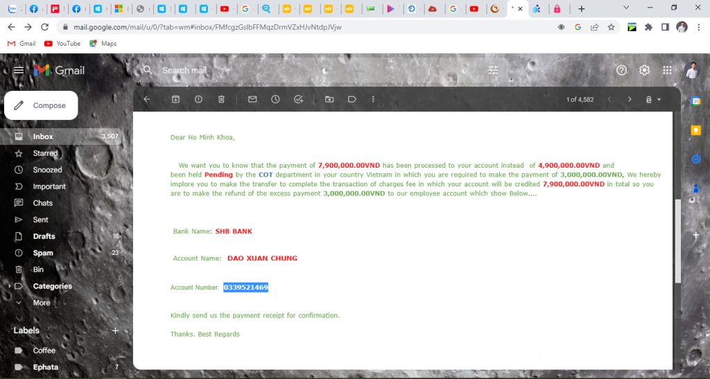 Scammer Alert: Dao Xuan Chung Reported: November 16, 2024 Scammer Information Full Name: Dao Xuan Chung Payment Gate: SHB Bank Payment Account: 0339521469 Category: Marketplace scams Source: Checkscam Evidence Files Report Description Lừa kêu chuyển tiền 3tr trước để được thanh toán 7tr9 bán hàng. Comments Your comment Add Comment No comments yet. Be the first to share your experience with this scammer.