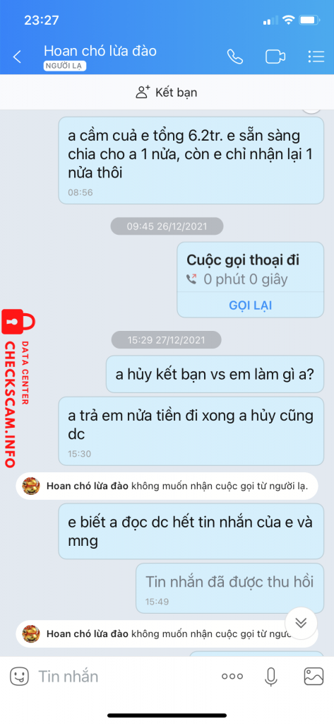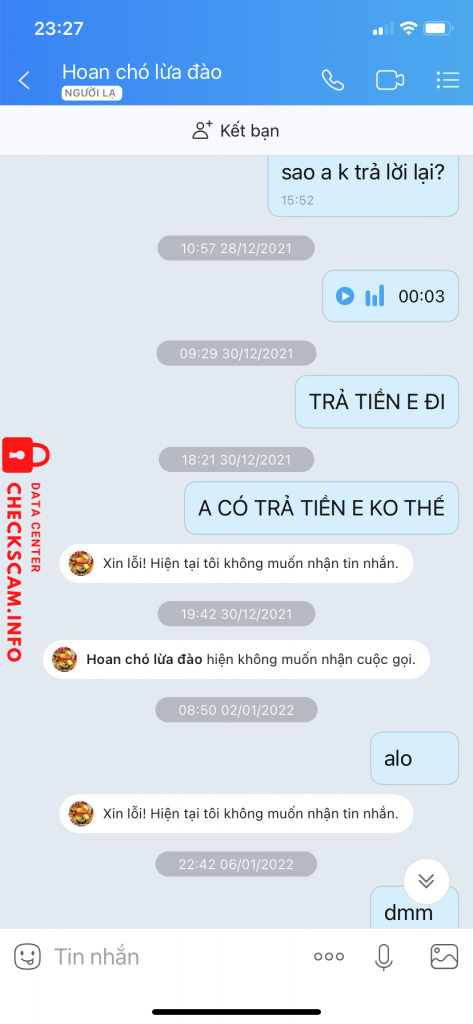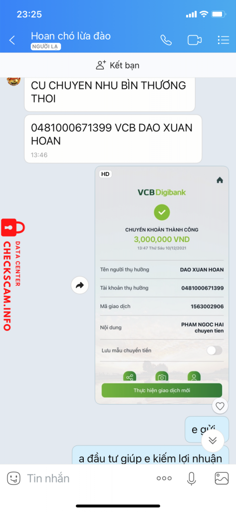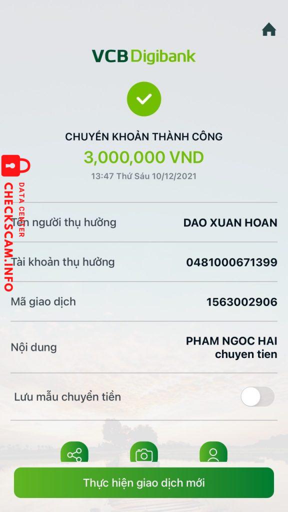 Scammer Alert: DAO XUAN HOAN Reported: November 16, 2024 Scammer Information Full Name: DAO XUAN HOAN Payment Gate: VIETCOMBANK Payment Account: 0481000671399 Category: Marketplace scams Source: Checkscam Evidence Files Report Description Nhận tiền đầu tư của người khác xong chặn zalo/chặn mọi liên hệ để không trả lại tiền Comments Your comment Add Comment No comments yet. Be the first to share your experience with this scammer.