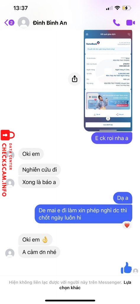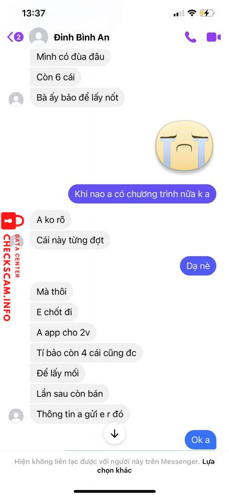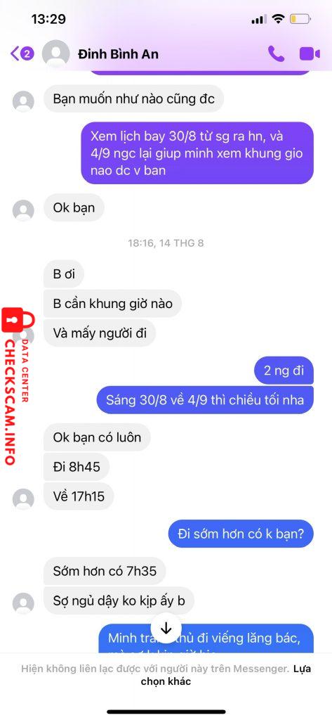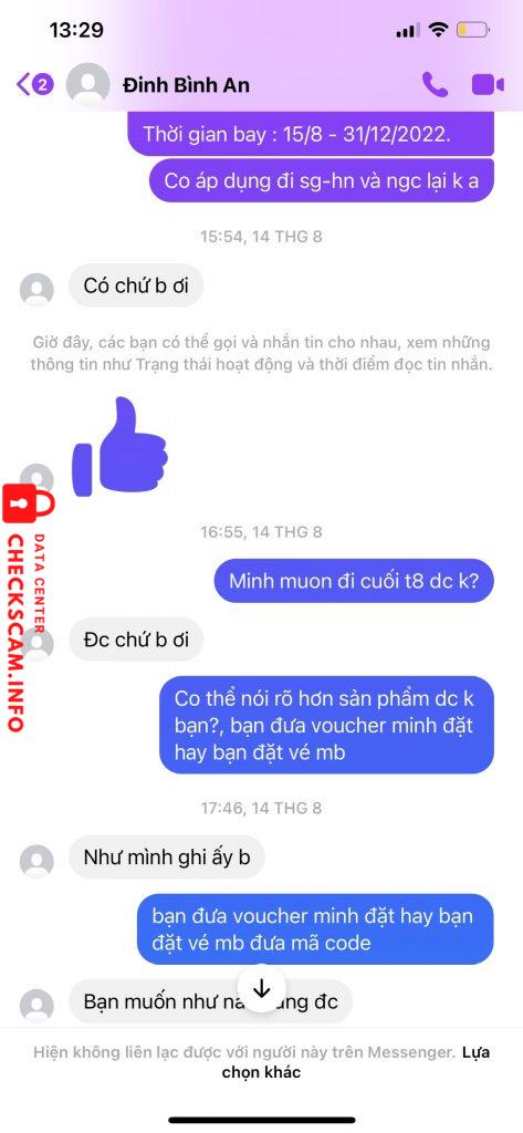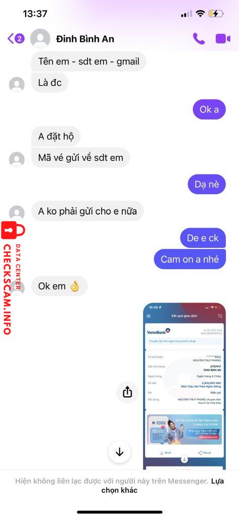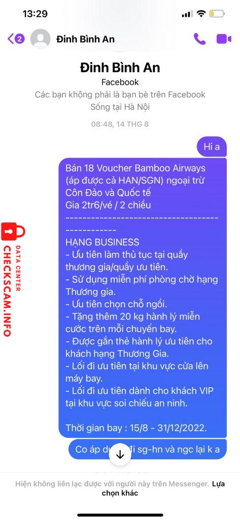 tên fb: Đinh Bình An : Đăng bài lừa đảo bán voucher vé máy bay bamboo hạng thương giá, chuyển khoản 5.200.000 đồng xong chặn fb không liên hệ được, mong đăng lên đây để mọi người biết còn tránh ra.