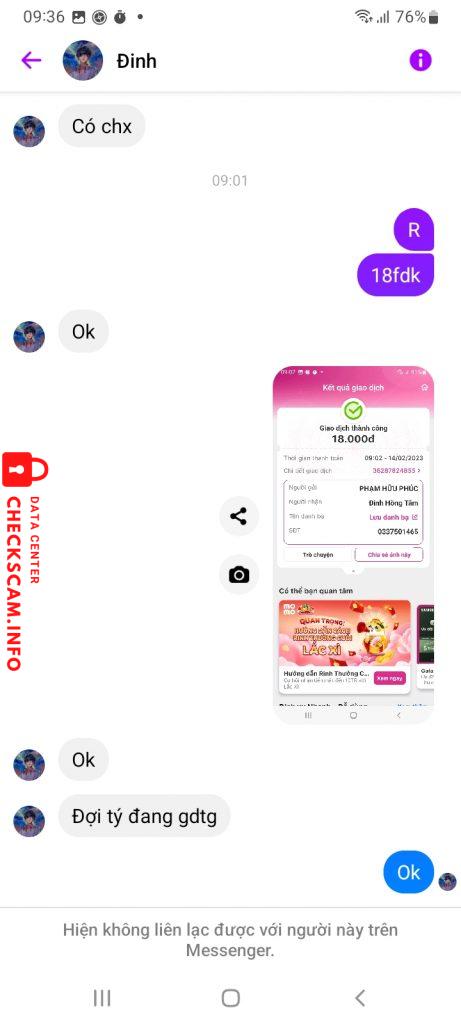 Scammer Alert: DINH HONG TAM Reported: November 16, 2024 Scammer Information Full Name: DINH HONG TAM Phone Number: 0337501465 Payment Gate: MOMO Payment Account: 0337501465 Category: Marketplace scams Source: Checkscam Evidence Files Report Description 2 acc đầu đưa đều và ut nhừn bill cuối lại scam Comments Your comment Add Comment No comments yet. Be the first to share your experience with this scammer.