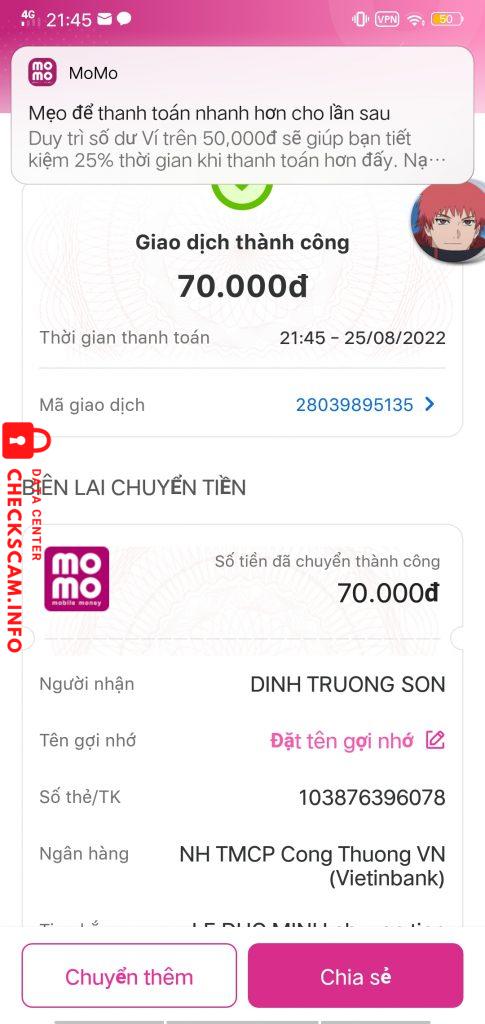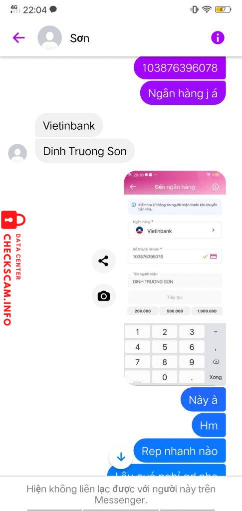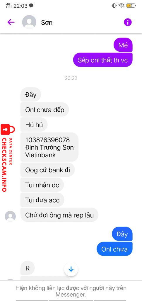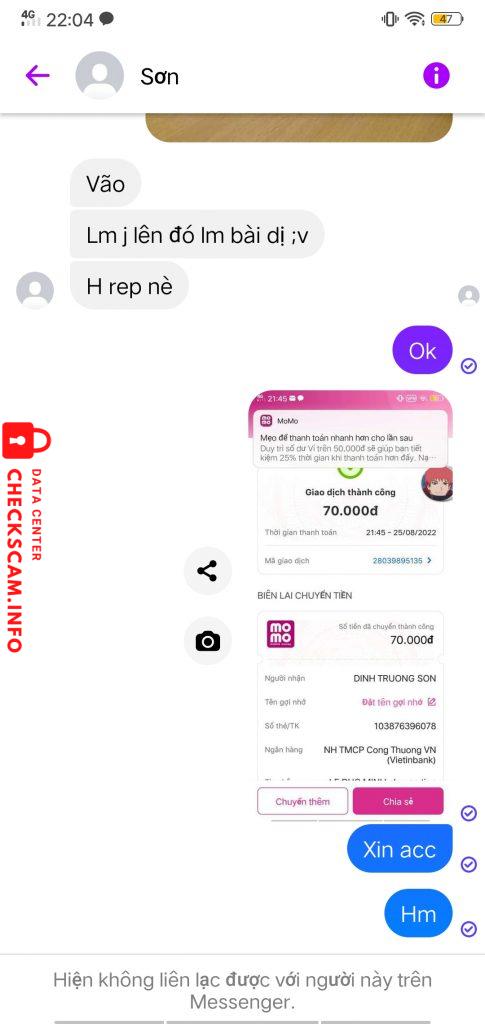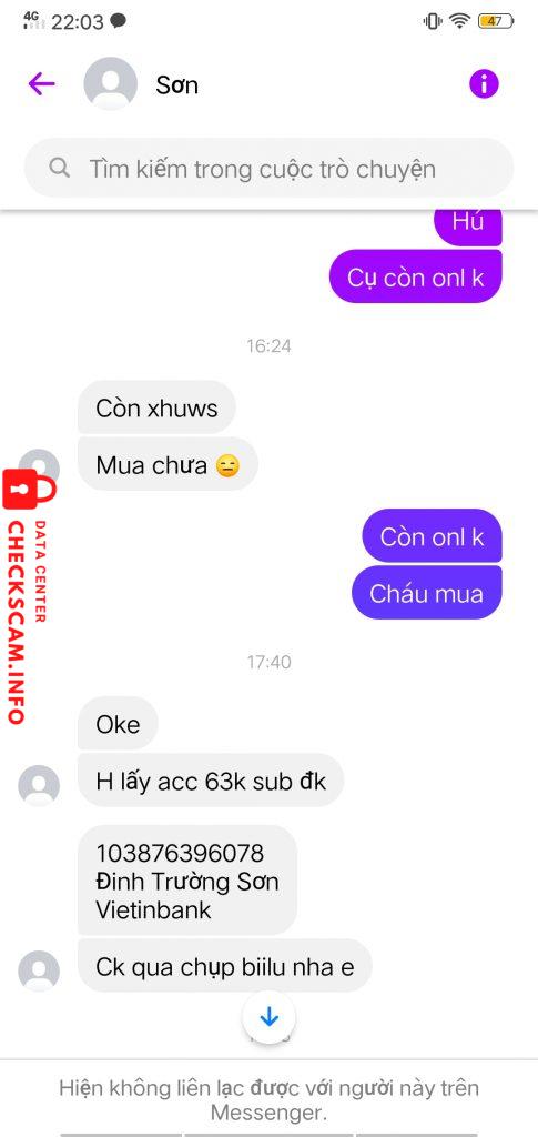 Scammer Alert: Dinh Truong Son Reported: November 16, 2024 Scammer Information Full Name: Dinh Truong Son Payment Gate: Vietinbank Payment Account: 103876396078 Category: Marketplace scams Source: Checkscam Evidence Files Report Description Mua acc nhưng bank xong r thì block Comments Your comment Add Comment No comments yet. Be the first to share your experience with this scammer.