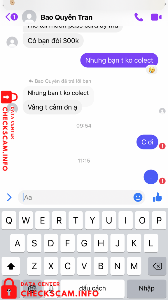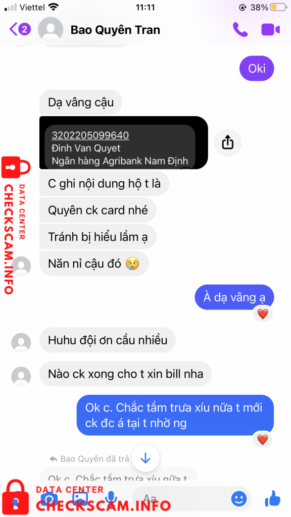Scammer Alert: Đinh Van Quyet Reported: November 16, 2024 Scammer Information Full Name: Đinh Van Quyet Payment Gate: Agribank Payment Account: 3202205099640 Category: Marketplace scams Source: Checkscam Evidence Files Report Description Scam Kook per3 200k Comments Your comment Add Comment No comments yet. Be the first to share your experience with this scammer.