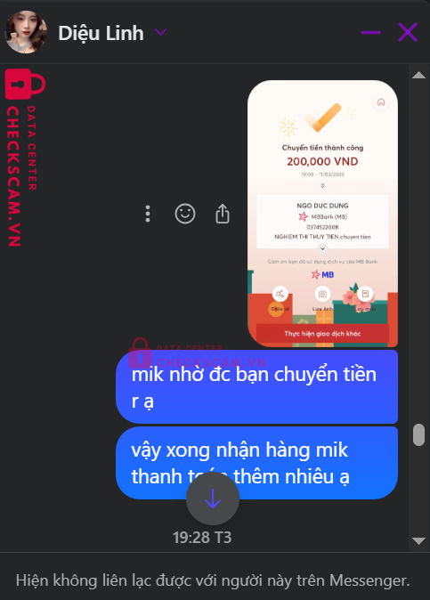 Scammer Alert: Đỗ Đức Cường Reported: May 10, 2025 Scammer Information Full Name: Đỗ Đức Cường Payment Gate: Quân đội MB Payment Account: 0374522008 Category: Marketplace scams Source: Checkscam Evidence Files Report Description Lừa đảo mua bán sách truyện, chuyển khoản xong block Comments Your comment Add Comment No comments yet. Be the first to share your experience with this scammer.