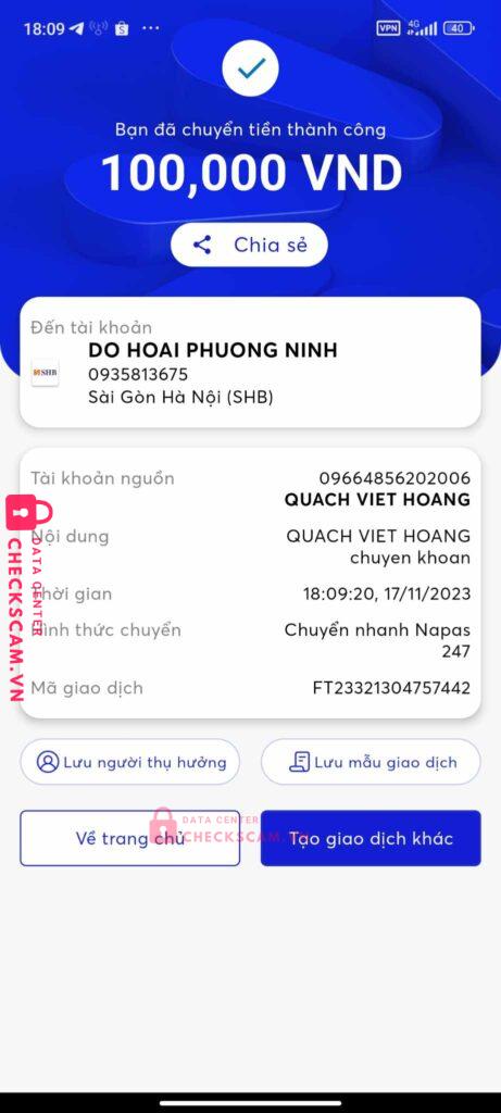 Scammer Alert: DO HOAI PHƯƠNG NINH Reported: November 16, 2024 Scammer Information Full Name: DO HOAI PHƯƠNG NINH Payment Gate: SHB Payment Account: 0935813675 Category: Marketplace scams Source: Checkscam Evidence Files Report Description Scam của tôi hết 100 và 600k tôi đánh lên mong anh em tránh xa thể loại này ạ xin cảm ơn Comments Your comment Add Comment No comments yet. Be the first to share your experience with this scammer.