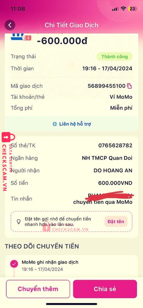 Scammer Alert: DO HOANG AN Reported: November 16, 2024 Scammer Information Full Name: DO HOANG AN Payment Gate: MB bank Payment Account: 0765628782 Category: Marketplace scams Source: Checkscam Evidence Files Report Description Lừa đảo làm đồ án Comments Your comment Add Comment No comments yet. Be the first to share your experience with this scammer.