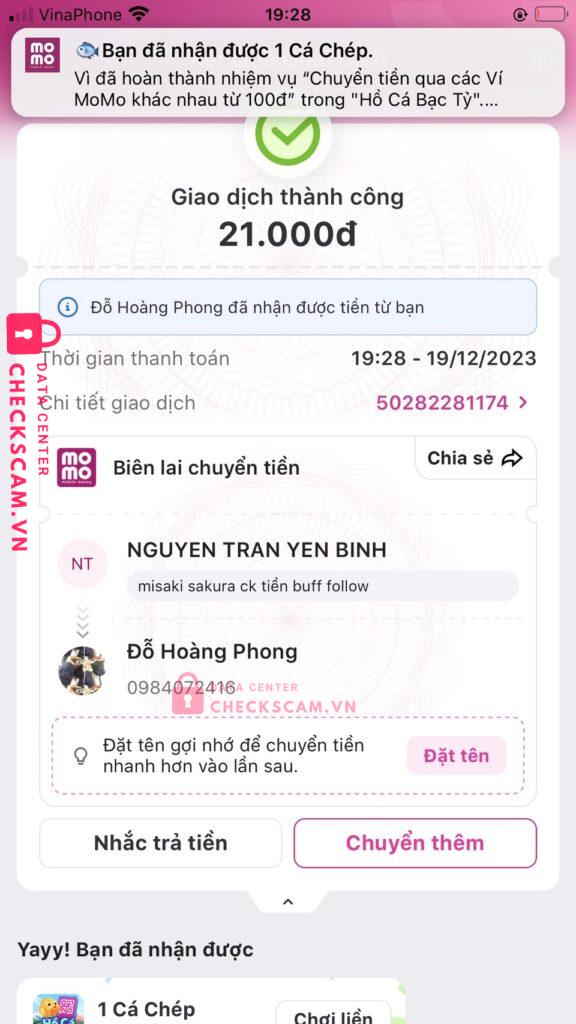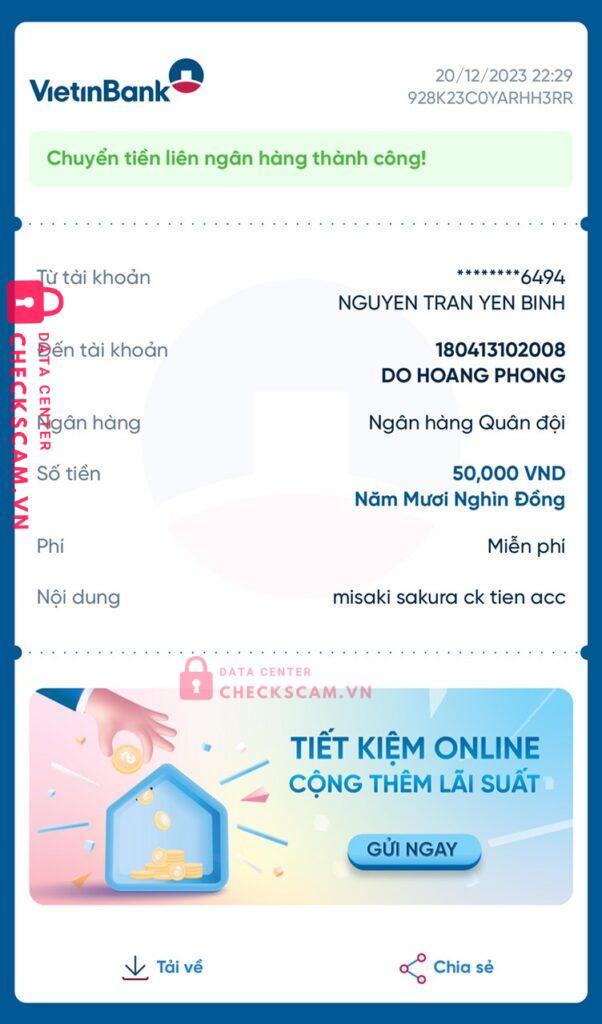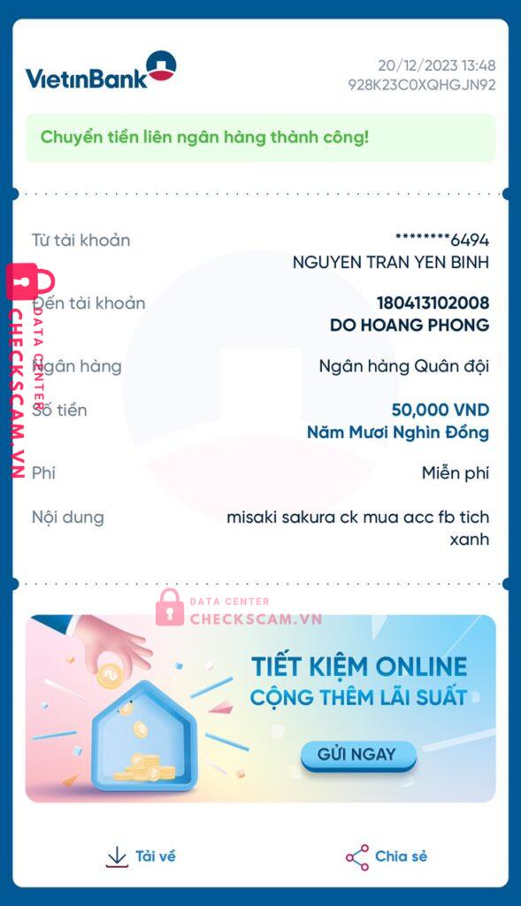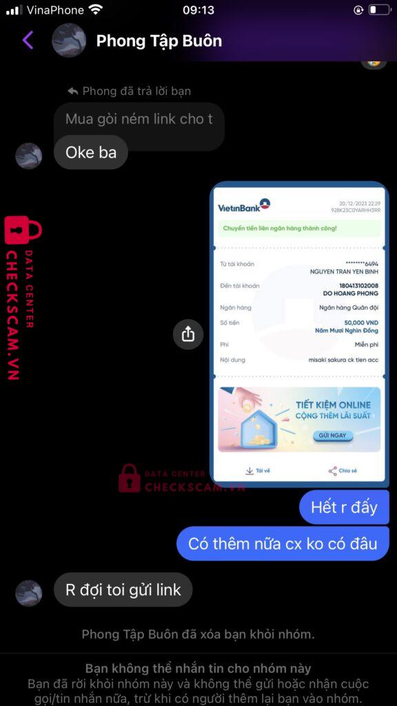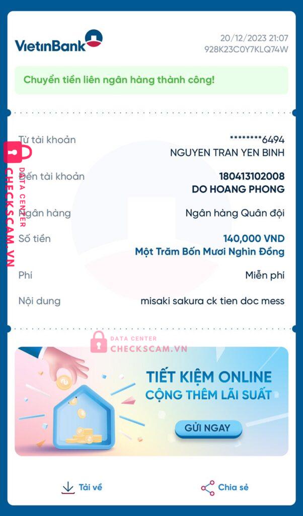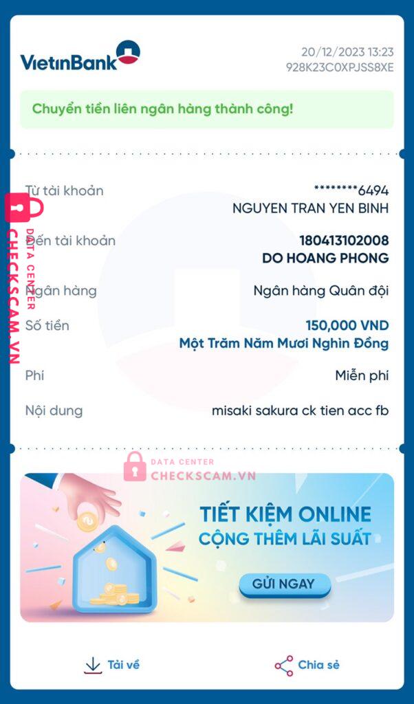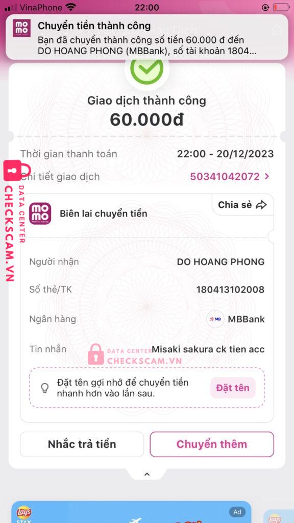 Scammer Alert: DO HOANG PHONG Reported: November 16, 2024 Scammer Information Full Name: DO HOANG PHONG Payment Gate: MB Bank Payment Account: 180413102008 Category: Marketplace scams Source: Checkscam Evidence Files Report Description Lợi dụng lòng tin của người khác chiếm đoạt tài sản ở giá trị cao không hề uy tín, mn cận thận đừng nên chuyển khoản vội vàng, bạn này ăn nói ngọt lắm Comments Your comment Add Comment No comments yet. Be the first to share your experience with this scammer.