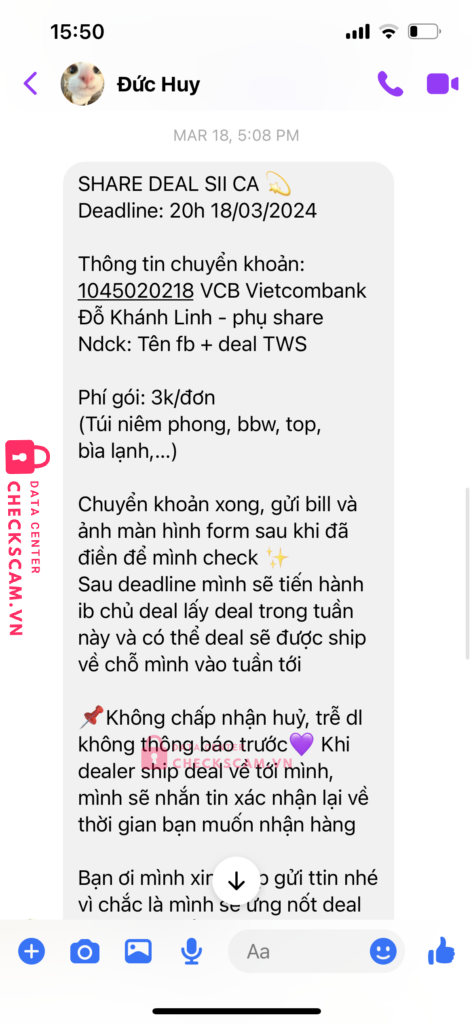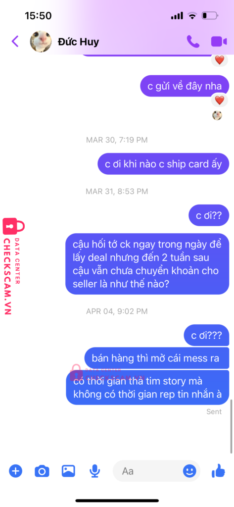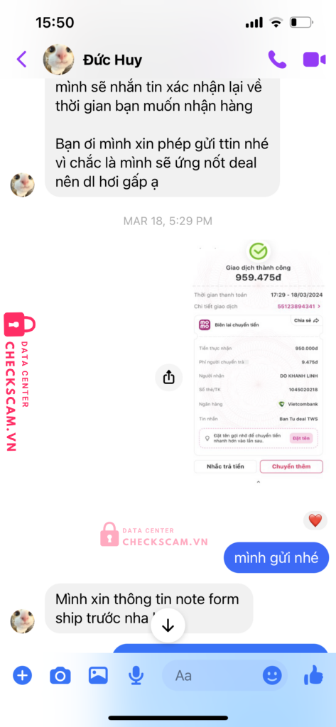 Tôi có chuyển khoản 750k vào stk này để mua một chiếc photocard từ ngày 18/03 nhưng sau khi nhận tiền người này đã cắt đứt liên lạc, không gửi hàng và cũng không trả lời tin nhắn của tôi.