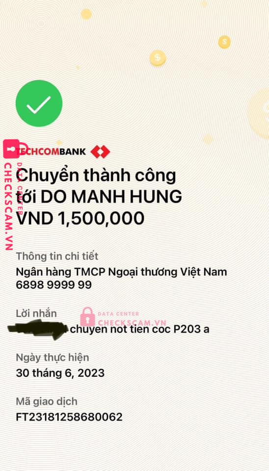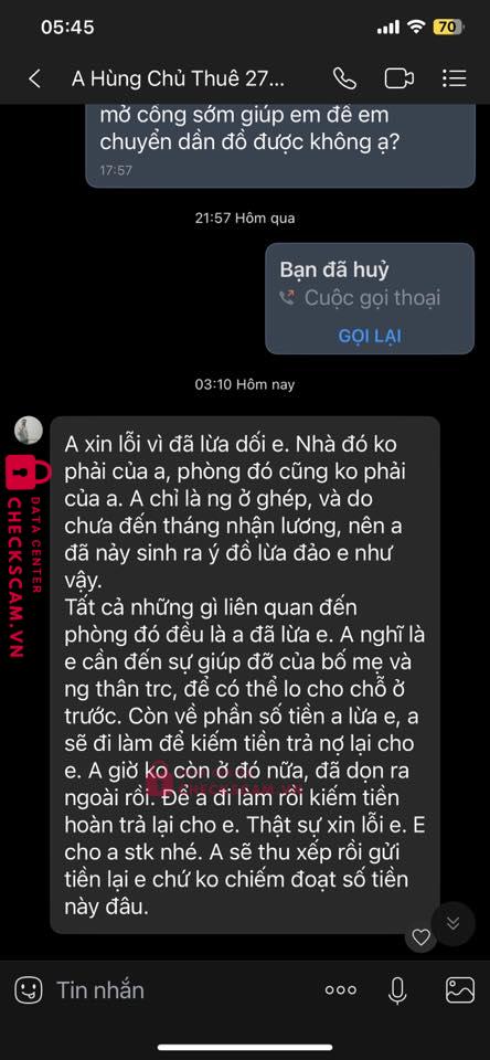Ngày 28/6 mình có qua xem phòng Dịch Vọng theo số điện thoại 097 2699191 và người trong ảnh. Đến tận nơi bạn này mở khoá cổng bằng vân tay rồi dẫn mình vào xem phòng tầng 3. Thì bạn nói bạn ấy là chủ nhà và nói rất nhiều câu chuyện cực kì hay về toà nhà đó. Nói cả về quy định, mọi người, sinh hoạt, gửi xe,… đưa chúng mình lên tầng 8 giới thiệu chỗ phơi, camera rồi cây cối đủ kiểu.Thì chúng mình chốt ở nhưng 15/7 mới có thể chuyển vào. Bạn ấy kêu cọc tiền phòng và kí hợp đồng thì sẽ chắc chắn hơn là cọc 500k chỉ viết tay. Nên chúng mình đã chuyển trước 1tr5 rồi hôm sau chuyển nốt. Tất cả mọi thứ tưởng xong xuôi thì mình nhận tin dữ ngày 14/7 là bạn này KHÔNG PHẢI CHỦ NHÀ và nhắn cho mình rất dài như ảnh. Mình rất sốc và hôm sau phải chuyển rồi. Đây là BÀI HỌC VÀ MÌNH CHƯA BIẾT RÚT KINH NGHIỆM KIỂU GÌ đây ạ. BẠN NÀY RẤT TINH VI CHUYÊN NGHIỆP.
