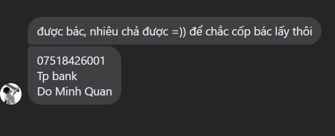 Scammer Alert: Do Minh Quan Reported: November 16, 2024 Scammer Information Full Name: Do Minh Quan Payment Gate: Tp bank Payment Account: 075184260010867594611 Category: Marketplace scams Source: Checkscam Evidence Files Report Description cọc đầy đủ, bảo gói hàng rồi nhưng không gửi mvd. gọi thì không trả lời Comments Your comment Add Comment No comments yet. Be the first to share your experience with this scammer.