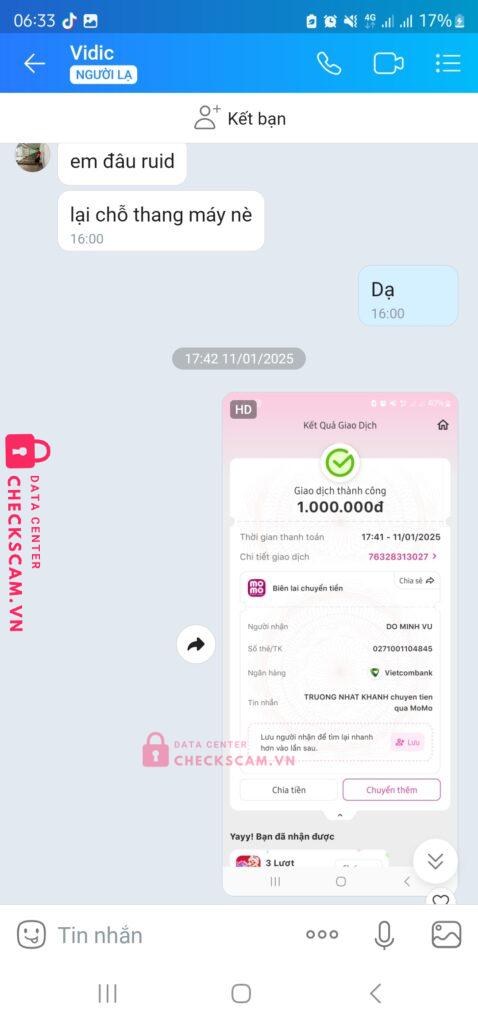 Scammer Alert: Do minh vu Reported: March 7, 2025 Scammer Information Full Name: Do minh vu Payment Gate: Momo Payment Account: 0337371118 Category: Marketplace scams Source: Checkscam Evidence Files Report Description Gymer đạo dụ lừa tiền. Nói ngon nói ngọt dắt đi ks xong giở giọng anh cần tiền gấp cho gia đình ck xg về là block chặn số nhau Comments Your comment Add Comment No comments yet. Be the first to share your experience with this scammer.