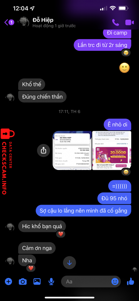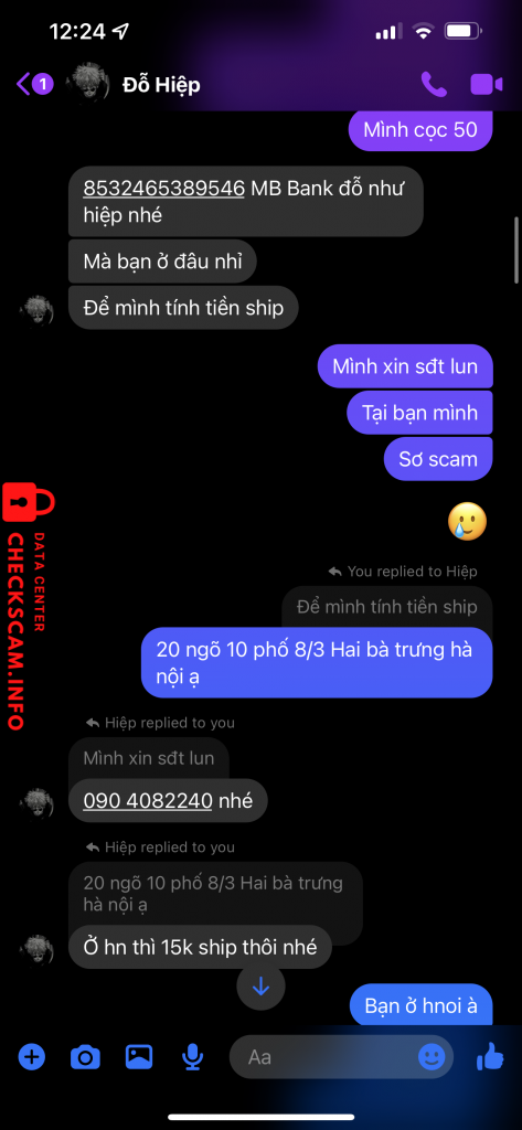 Scammer Alert: Đỗ Như Hiệp Reported: November 16, 2024 Scammer Information Full Name: Đỗ Như Hiệp Phone Number: 0904082241 Payment Gate: MB banks Payment Account: 8532465389546 Category: Marketplace scams Source: Checkscam Evidence Files Report Description Mua truyện 160 bị lừa đảo bên trong là hộp airpod.Gọi điện thì bảo là ko phải số của bạn ý nma trên hộp chuyển hàng là số vậy Comments Your comment Add Comment No comments yet. Be the first to share your experience with this scammer.